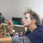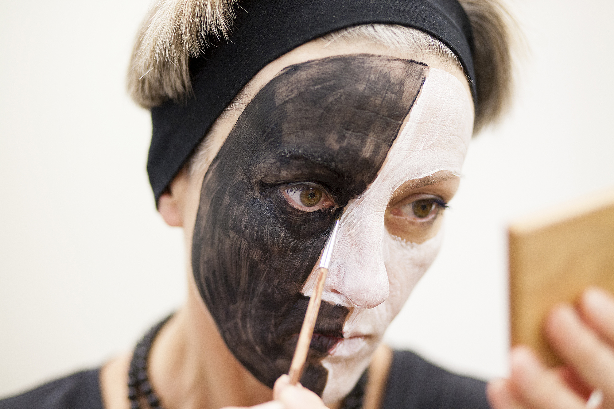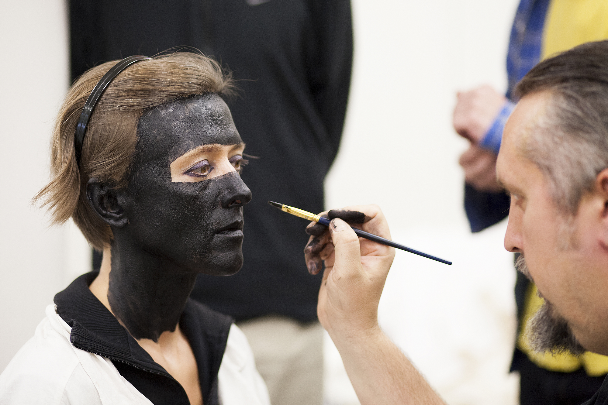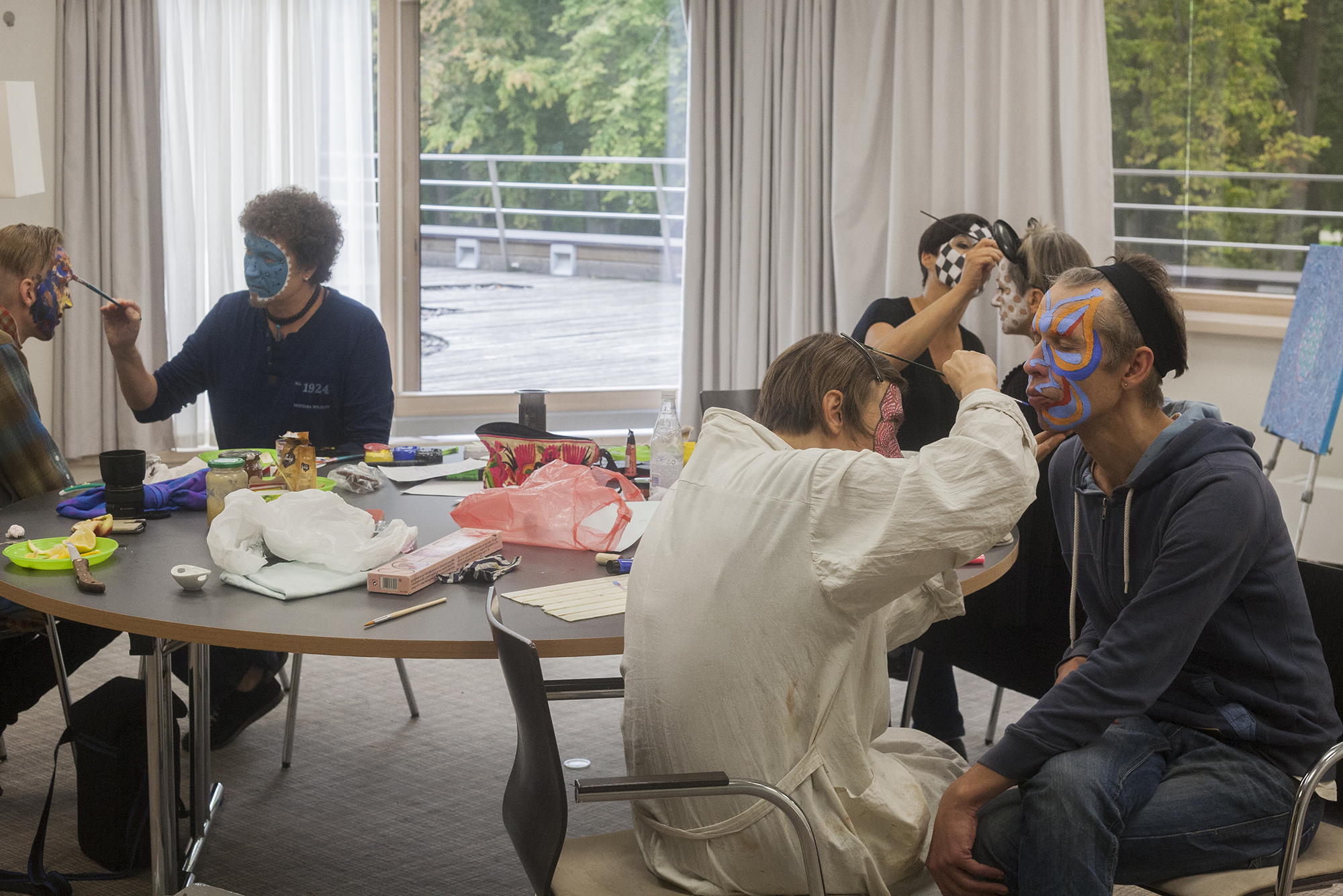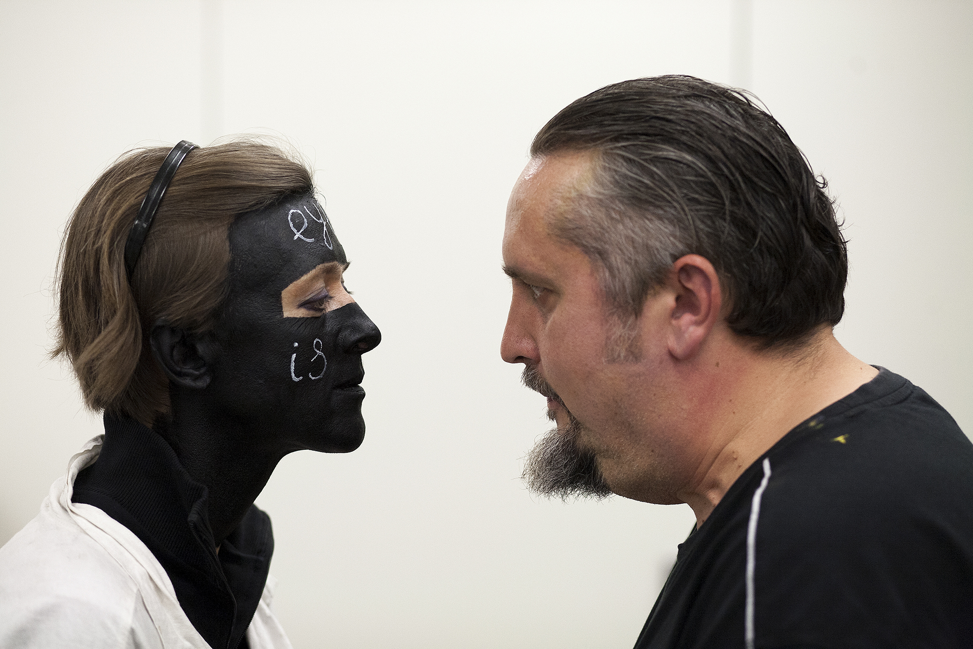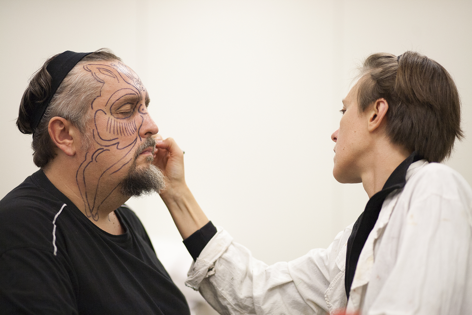 MIGLĖ KOSINSKAITĖ: „Su kūno menu susidūriau pirmą kartą. Jaučiausi truputį nedrąsiai: atrodė nejauku paimti ir liestis prie kito žmogaus, juolab nepažįstamo, veido, o paskui leistis, kad jis pieštų ant tavojo. Bet labai greitai persilaužėme. Visi esame profesionalai, tad į veidus pažvelgėme kaip į drobę – imi ir tapai. Viskas vyko ramiai, tvarkingai, sklandžiai, lyg būtume tai darę šimtą metų. Nors buvo ir nemigo naktų svarstant, ką ryte darysiu, ką piešiu. Visi dirbome įtemptai nuo ryto iki vakaro.“