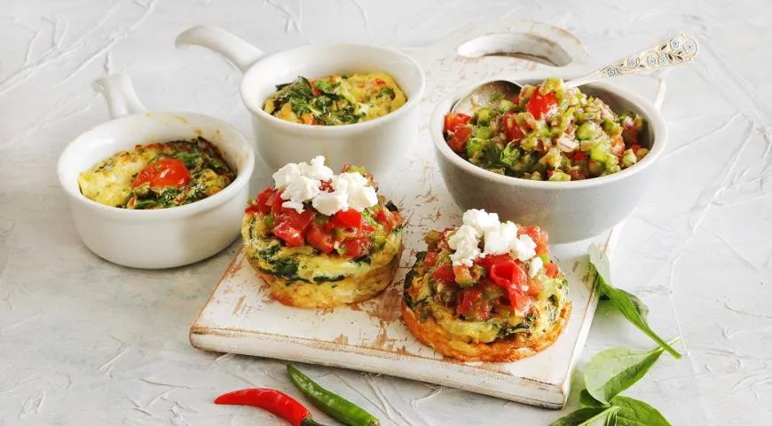 Reikės (12 porcijų): 12 kiaušinių, 1/4 stiklinės pieno, 50 g špinatų, 100 g vyšninių pomidorų, 1 vidutinio svogūno, 50 g fetos sūrio; salsai: 1 avokado, 2 vidutinių pomidorų, 0,5 žalios paprikos, 1 mažo raudonojo svogūno, 1/4 aitriosios paprikos, 1 česnako skiltelės, 5 kalendros šakelių, 1 šaukšto žaliosios citrinos sulčių, druskos, šviežiai maltų juodųjų pipirų.