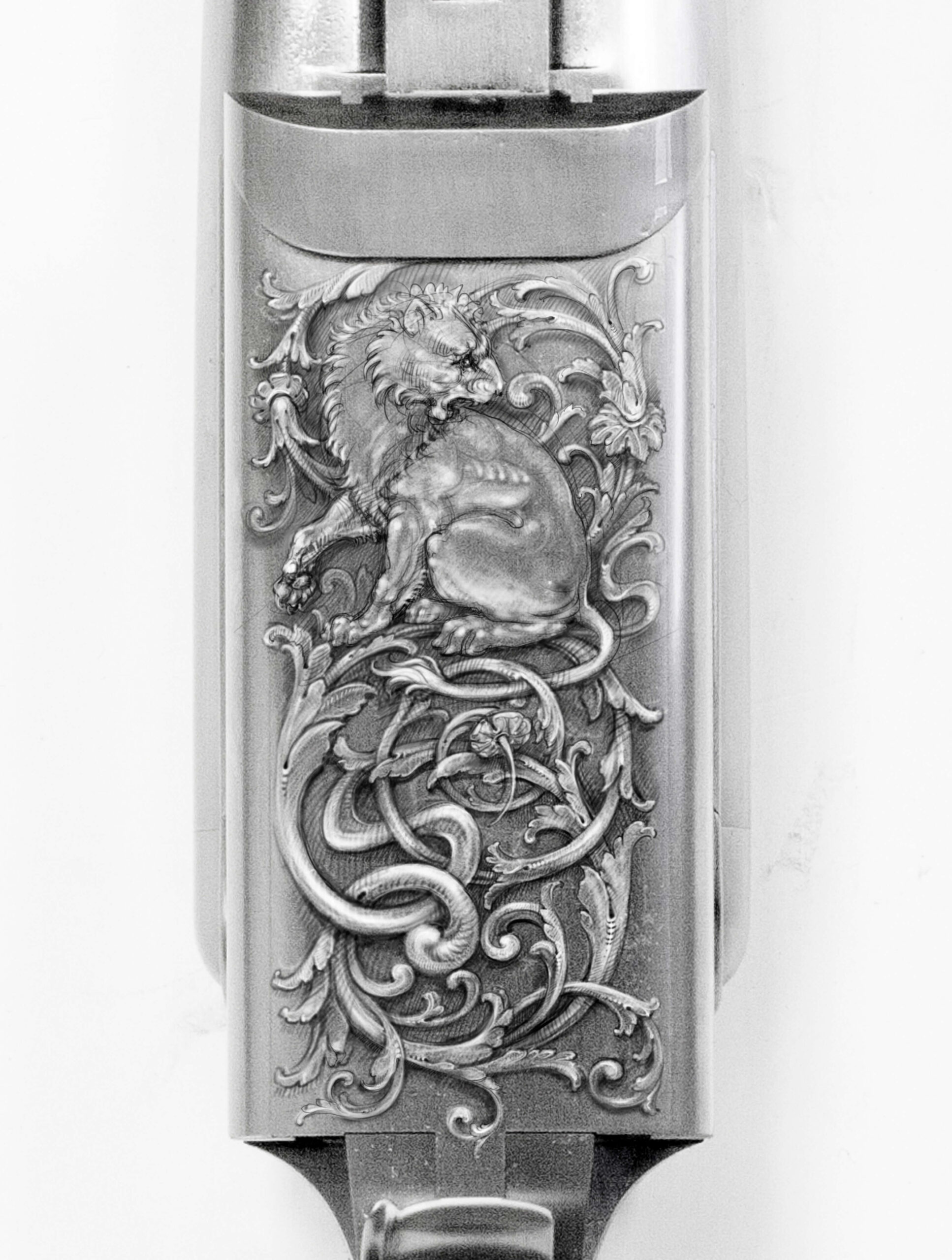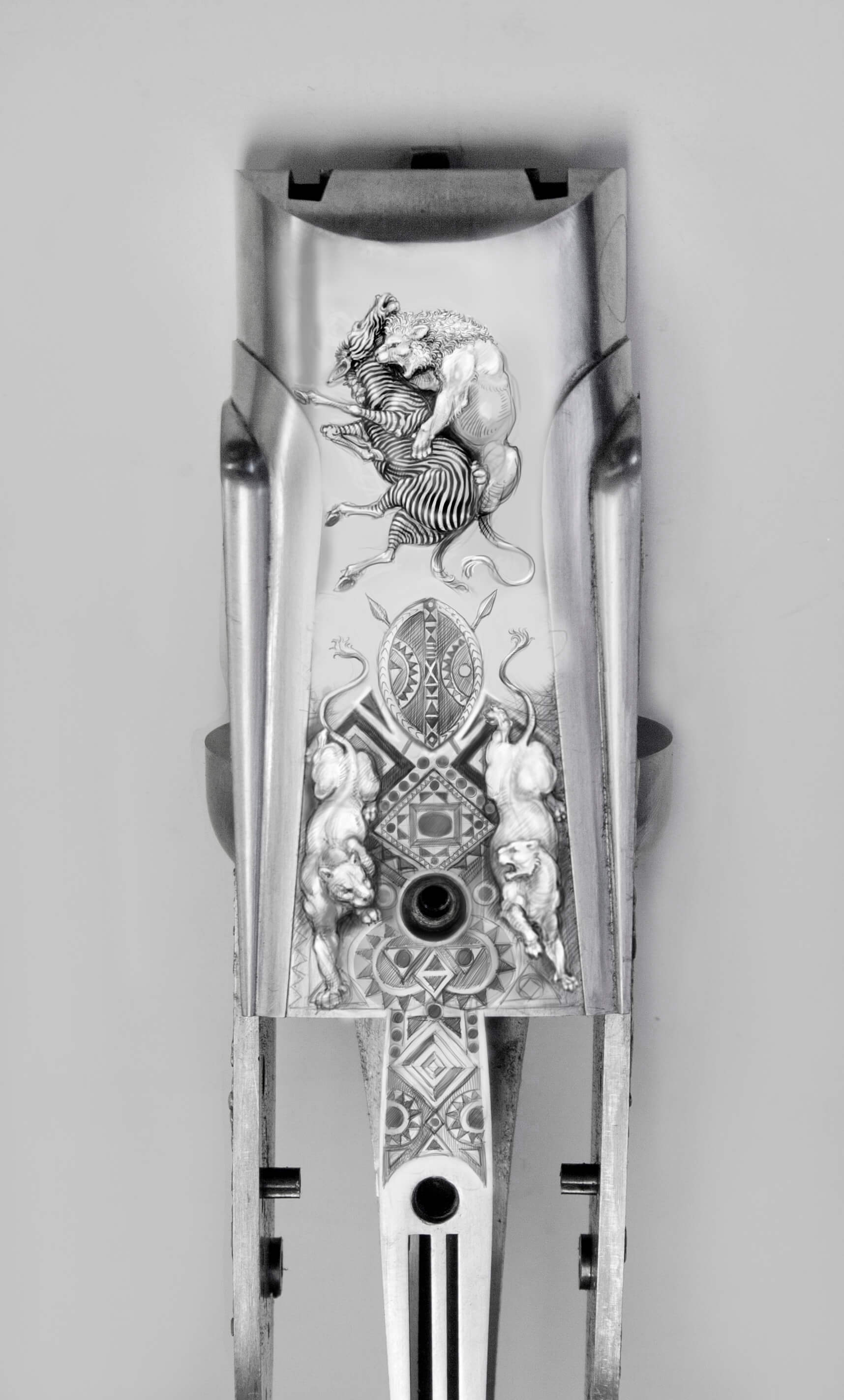 – Jūsų graviruoti ginklai mane sužavėjo medžioklės scenų meistryste. Zebrų, liūtų, raganosių, krokodilų ir kitokių egzotiškų žvėrių medžioklės neretai yra daugiafigūrės, tikrai sudėtingos. Antilopes medžioja leopardas ar gepardas, liūtas – antilopes ir t. t. Kas nulemia ikonografinės programos sudarymą, ar dėl to diskutuojama su užsakovu?