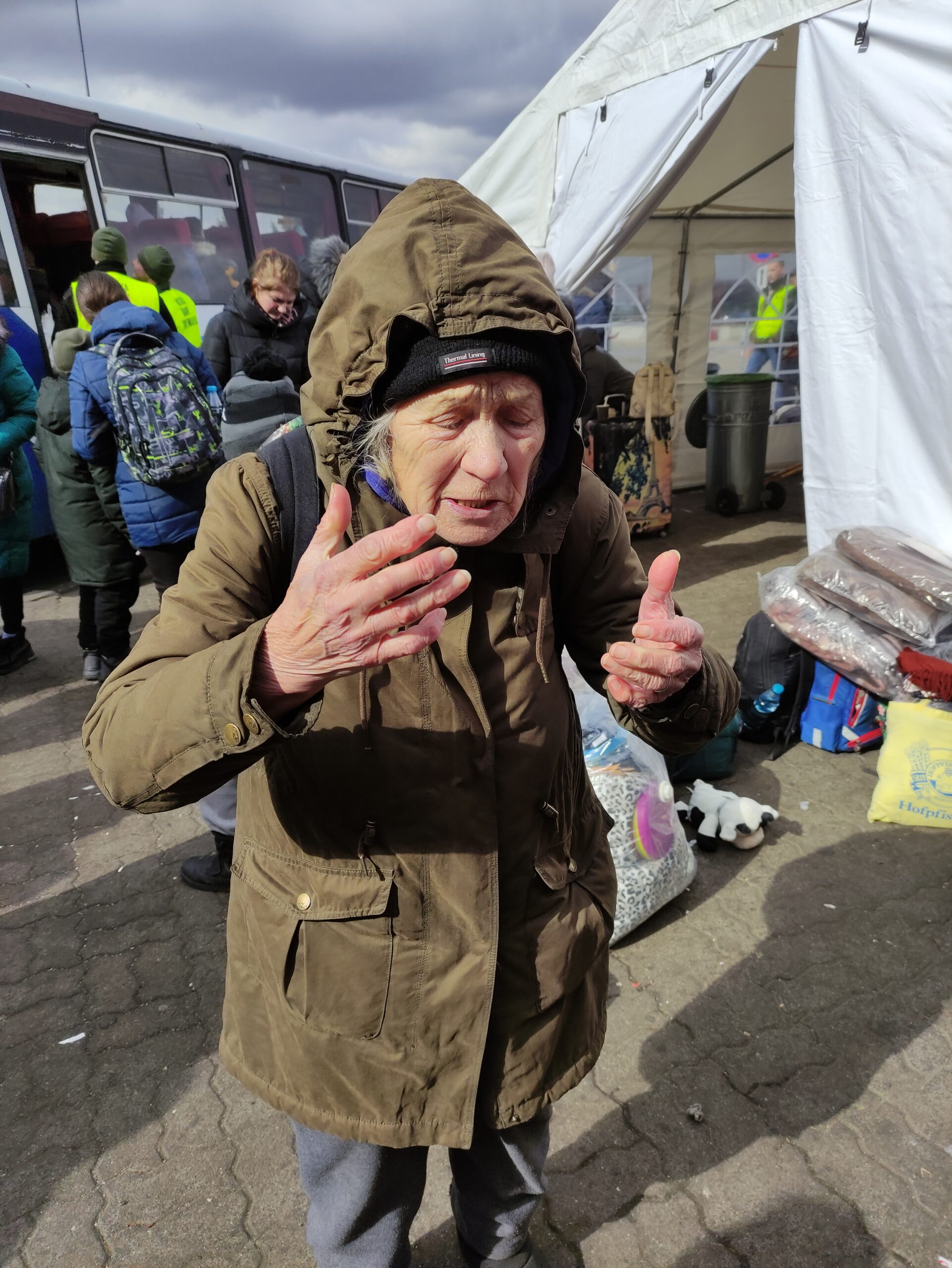 „Naktį buvo siaubingai šalta, eilėje teko stovėti aštuoniolika valandų, glaudėmės vieni prie kitų, trypčiojom, dalijomės užklotais“, – pasakoja 87 metų Raisa Semerenko, jau pasiekusi Lenkiją ir palapinėje laukianti autobuso tolesnei kelionei.