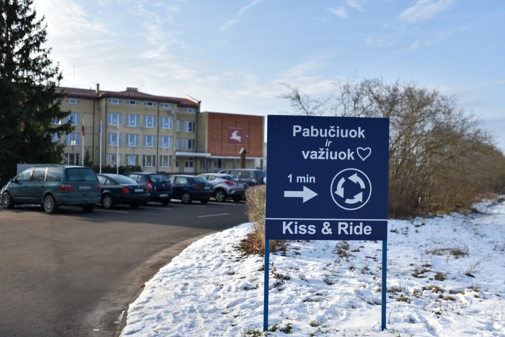 Prie įvažiavimo į mokyklos kiemą iš tolo šviečia mėlynas ženklas „Pabučiuok ir važiuok“, o išvažiuojant ne tik palinkima gero kelio, bet ir primenama nepamiršti pasiimti vaikų po pamokų.