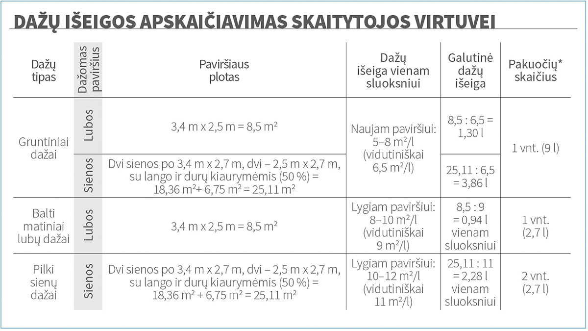Dažų sąnaudos skaičiuojamos pagal paviršiaus plotą, tad Elvyra atskirai sudėjo visus dažytinų sienų bei lubų plotus ir, pasinaudojusi dažų gamintojo interneto svetainėje pateikta skaičiuokle, nustatė, kiek dažų jai reikės viską nudažyti dviem sluoksniais. Kadangi skaičiuoklė negali įvertinti realaus paviršių paruošimo lygio ir jų gebėjimo daugiau ar mažiau įgerti dažus, gautą rezultatą ji priėmė kaip preliminarų ir dėl viso pikto dažų užsakė šiek tiek daugiau.