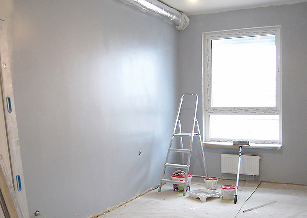 Svarbus momentas – tinkamai nudažyta lubų ir sienų sandūra: vienur turi likti balta spalva, o kitur – pilka.