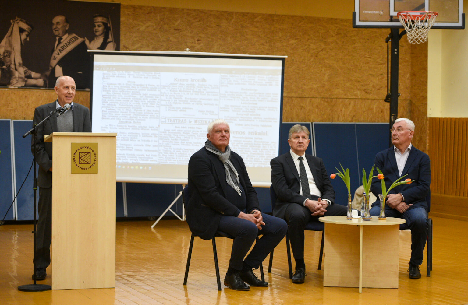 Po sveikinimo kalbų susirinkusieji išklausė istoriko Donato Pilkausko pranešimo „Krepšinis Lietuvoje ir Panevėžyje 1921–1960 metais“.