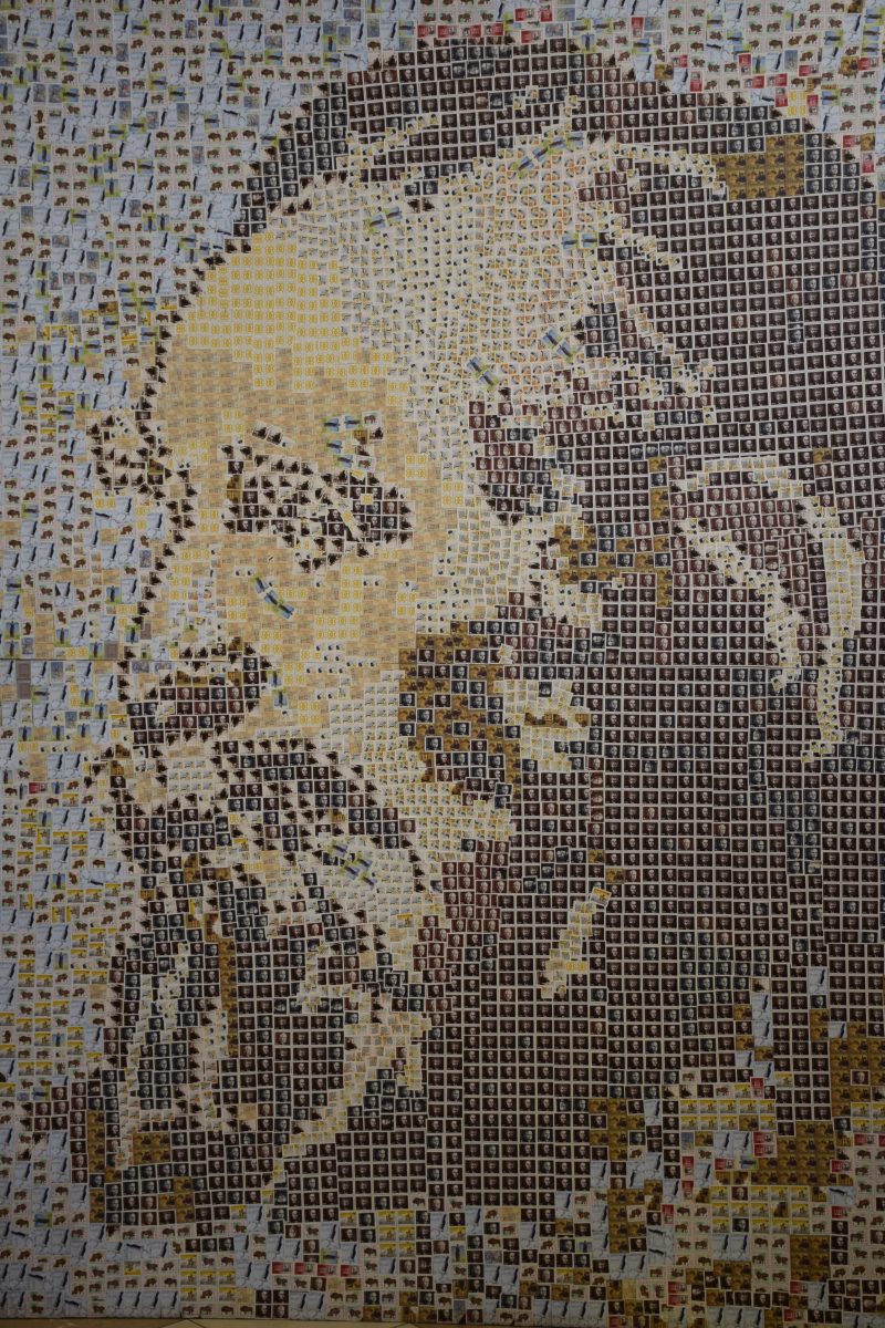 Mozaika iš galioti nustojusių ir iš apyvartos išimtų lito nominalo pašto ženklų sukurta pernai. Šitaip tąsyk kūrybiškai atsisveikinta su daugiau nei du dešimtmečius leistais „litiniais“ pašto ženklais, kuriuos pakeitė euro nominalo pašto ženklai. Šį neįprastą paveikslą sukūrė dailininkė J. Vaitkutė. Jaunoji menininkė, visą pasaulį stebinanti unikaliais kūriniais iš maisto produktų ir kitų netikėčiausių daiktų bei medžiagų, pašto ženklus kūrybai buvo pasitelkusi pirmąkart.