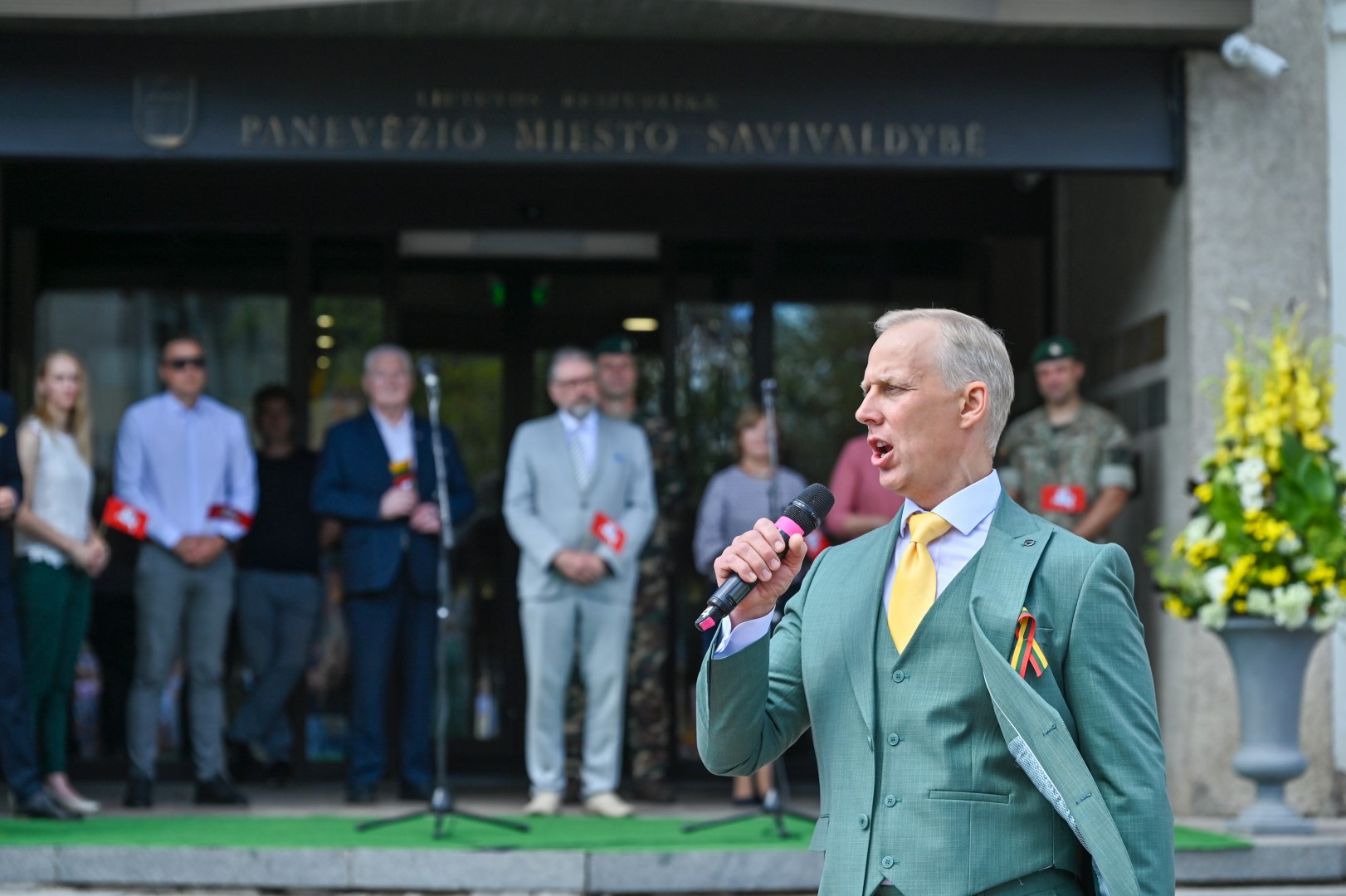 „Karaliaus Mindaugo dėka pradėjome Lietuvos kaip valstybės istorijos kelią. Jo karūnavimas davė pradžią vakarietiškai valstybei. Šiandien švenčiame mūsų pergales ir laimėjimus, šiandien švenčiame galimybę auginti savo valstybę. Tad dar kartą atsigręžkime į nueitą nelengvą, bet reikšmingą valstybingumo kelią ir iš praeities pasisėmę stiprybės būkime išdidūs ir vieningi savo šalies piliečiai. Viso pasaulio lietuvius šiandien sujungsianti Tautiška giesmė tegul garsiai ir plačiai neša žinią apie mūsų ryžtą saugoti ir ginti savo valstybę“, – vėliavos pakėlimo ceremonijoje sveikino Panevėžio meras Rytis Račkauskas.