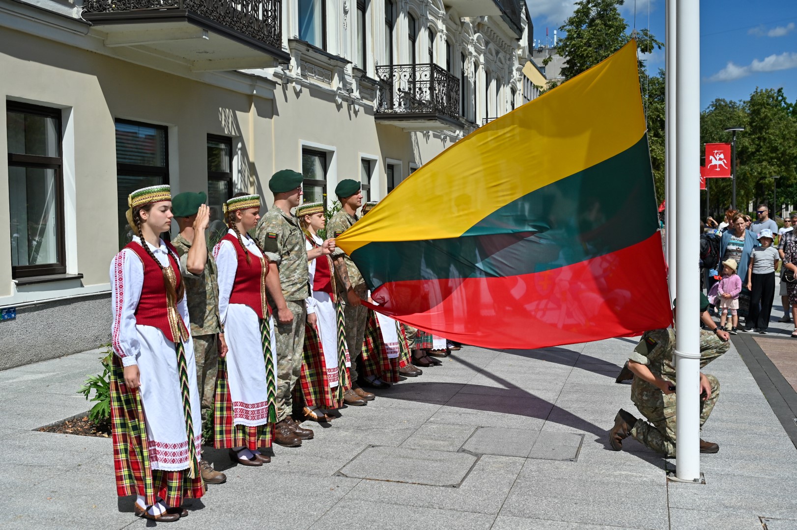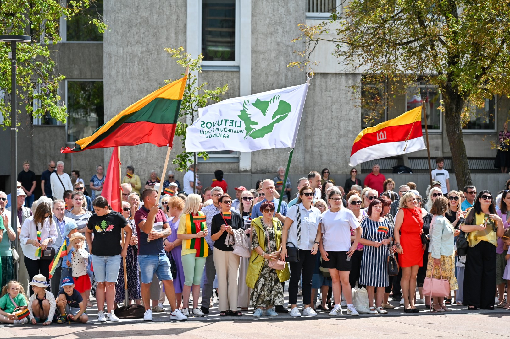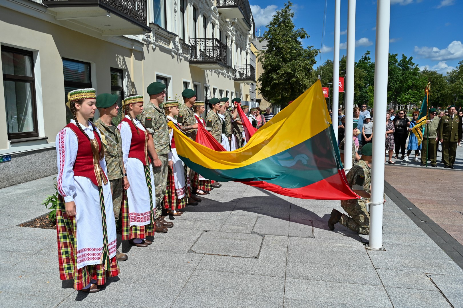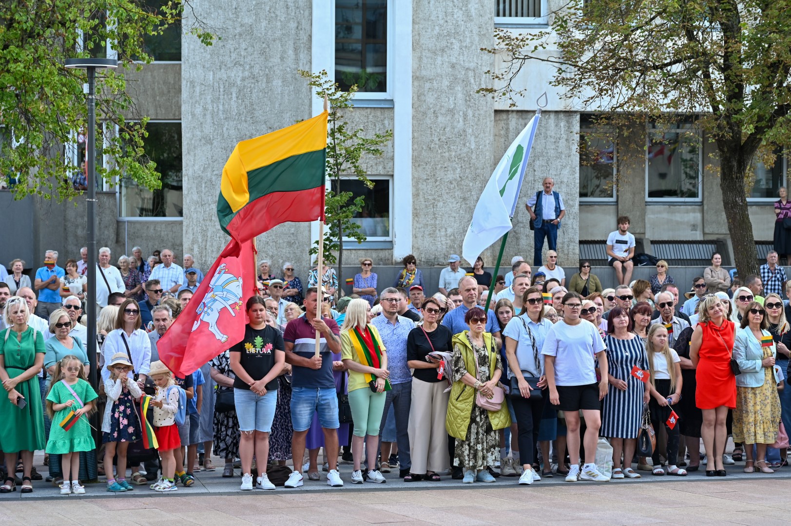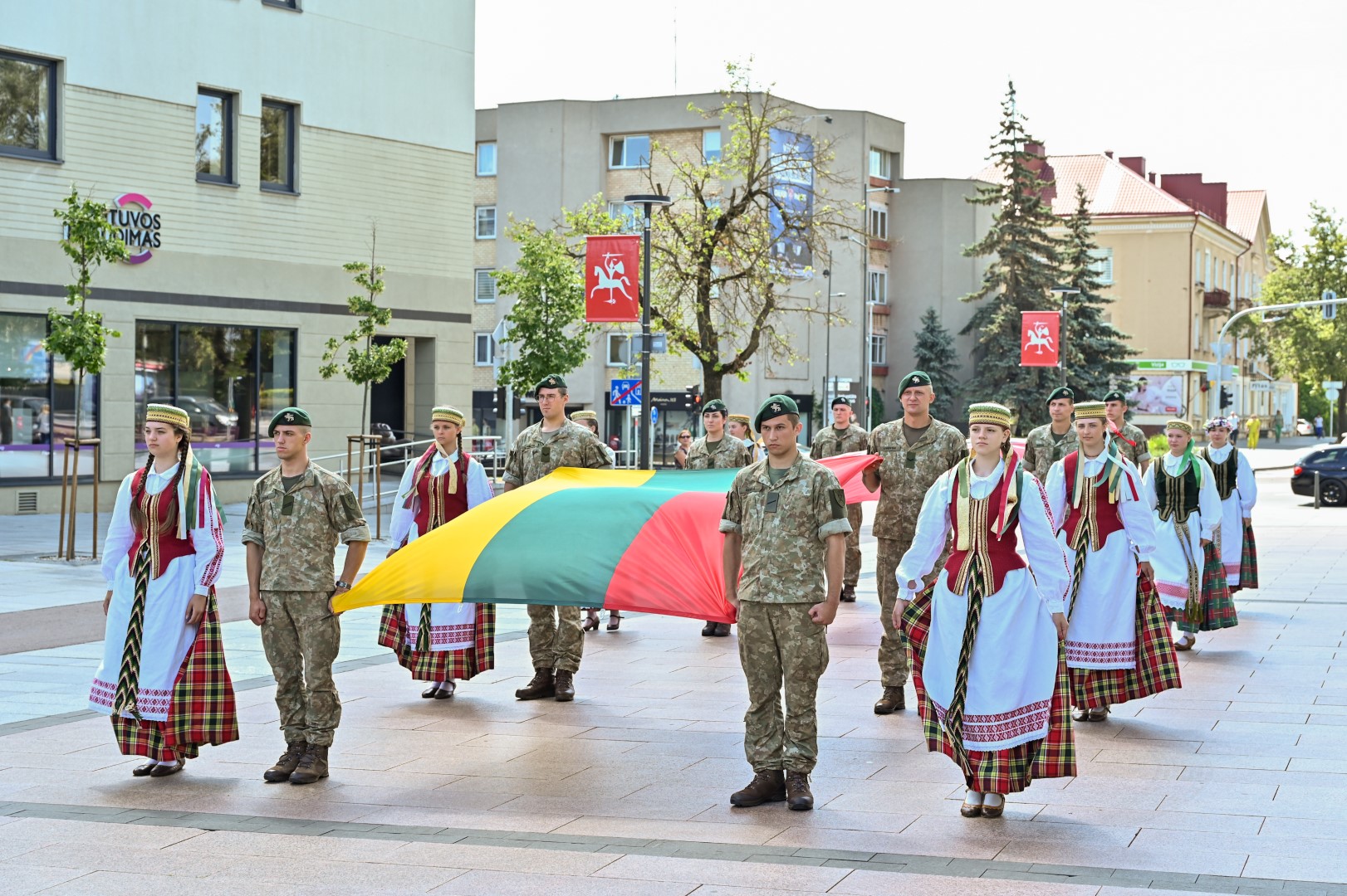 Vidurdienį Laisvės aikštėje, prie miesto Savivaldybės iškilmingai iškelta Trispalvė.