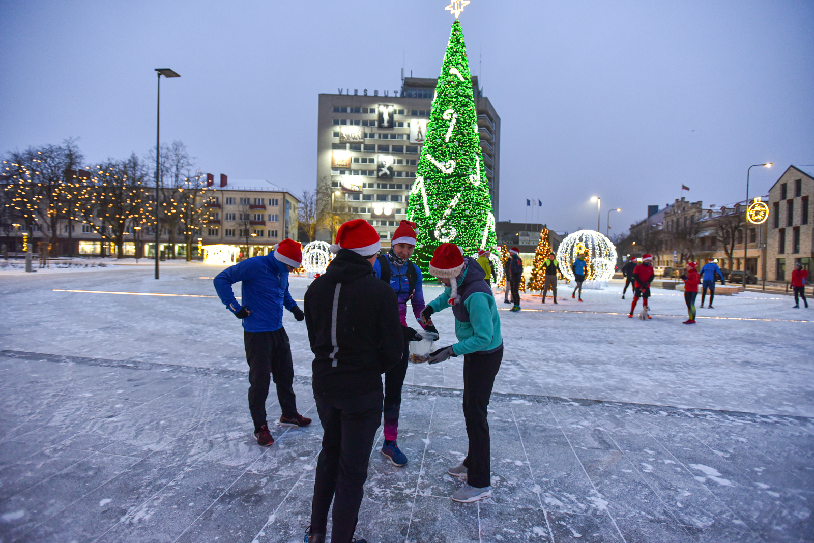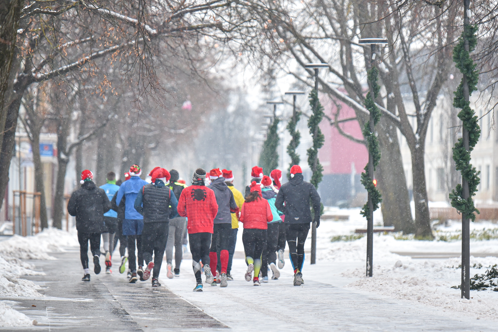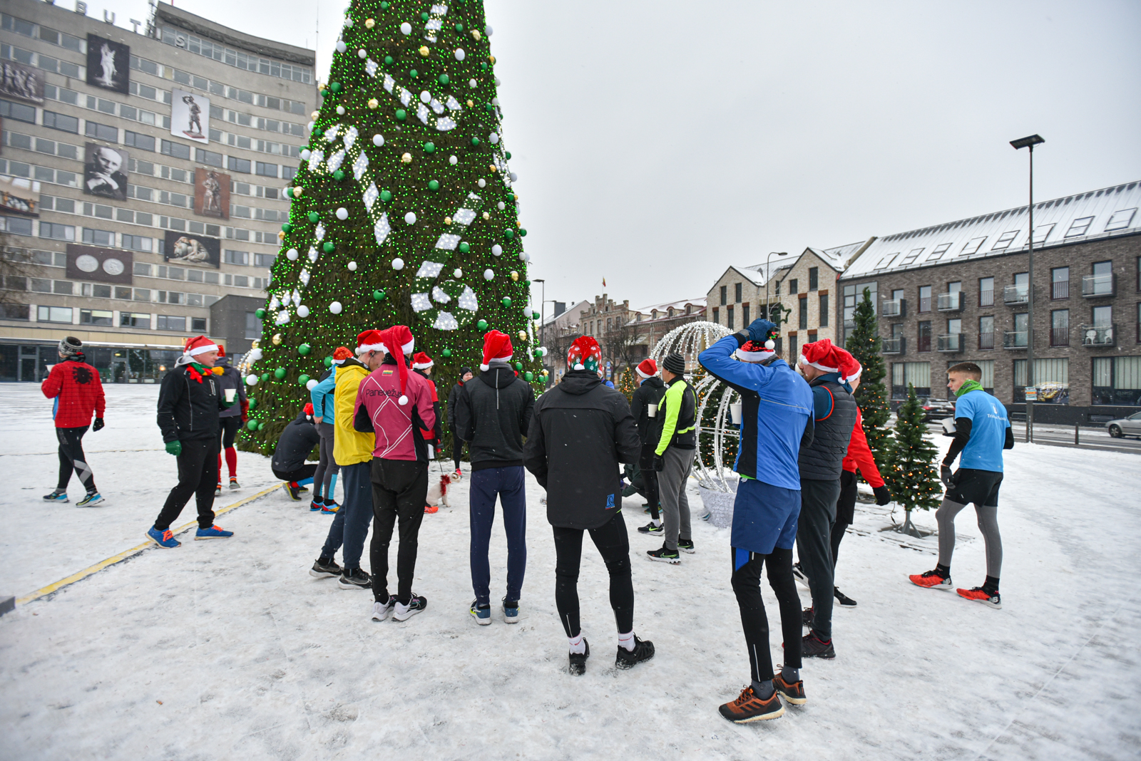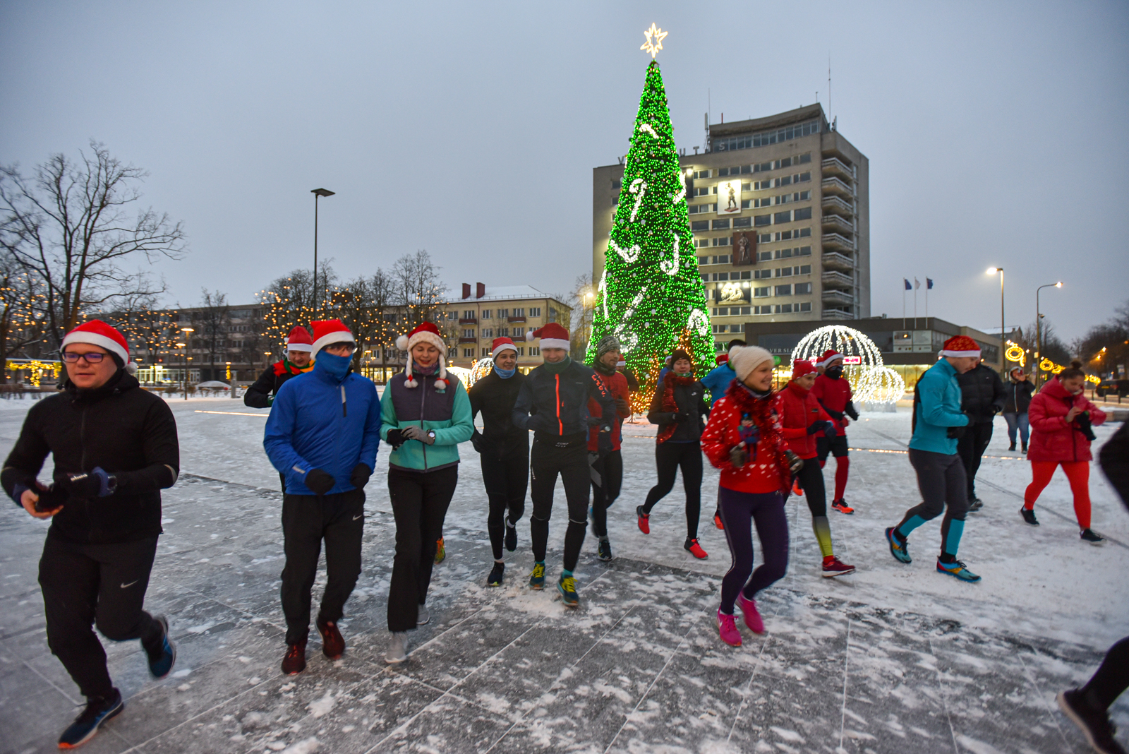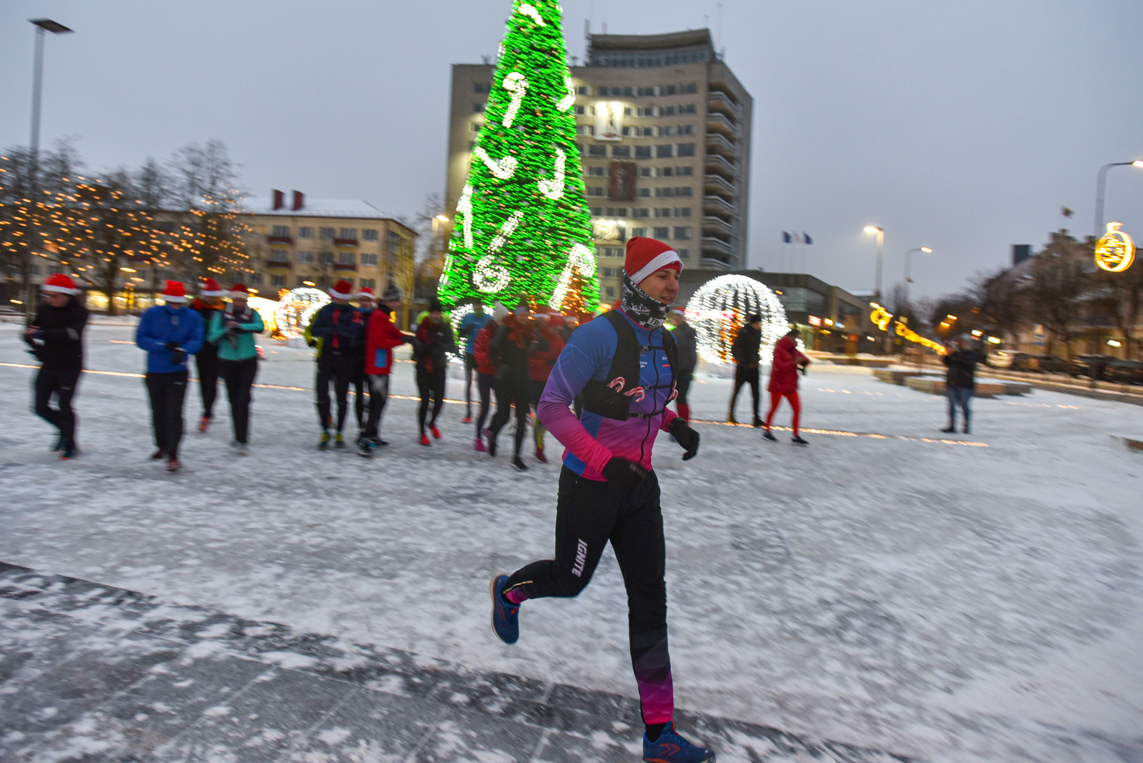 Iš čia būrys aistruolių startavo kalėdiniam bėgimui per miestą. Iš Laisvės aikštės bėgikai suko per rekonstruoti baigiamą Senvagę ir pagal Nevėžio upę Taikos alėja bėgo iki Kultūros ir poilsio parko. Jame apsukę ratą tuo pačiu maršrutu sugrįžo atgal, įveikę 10 kilometrų.