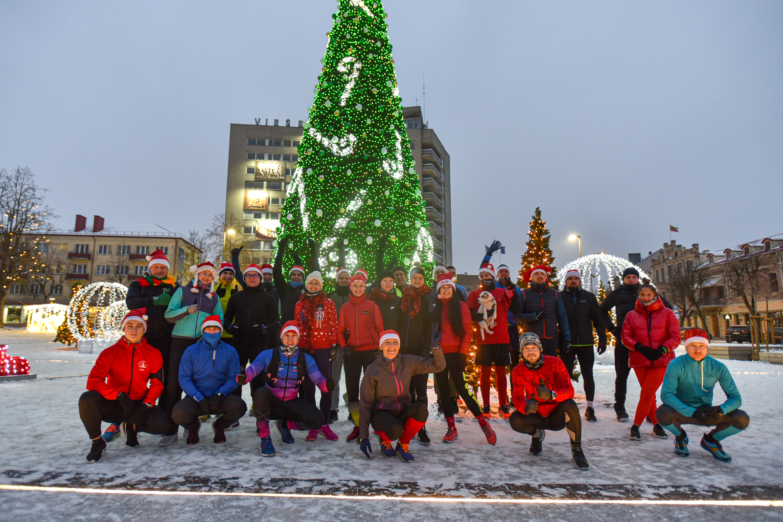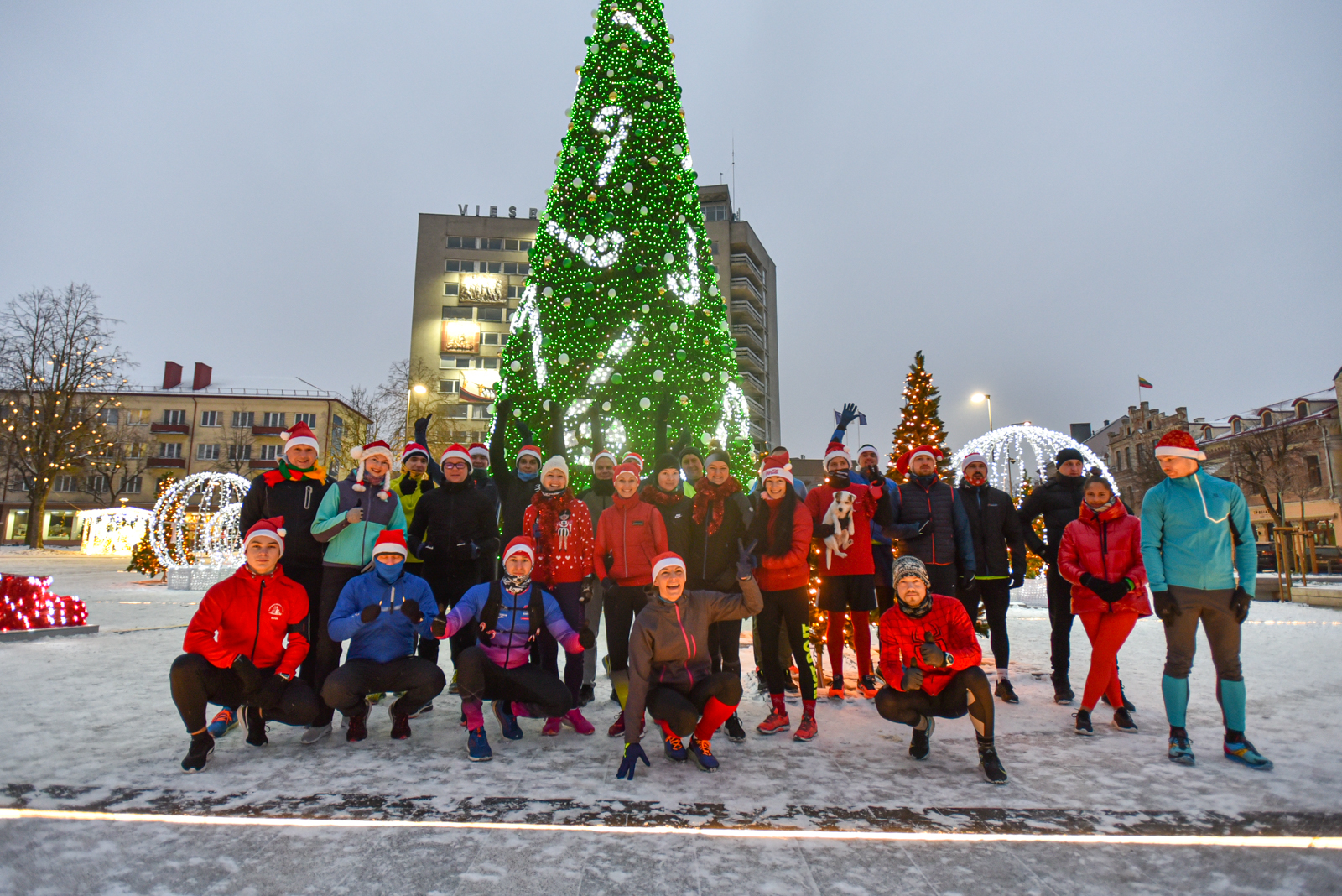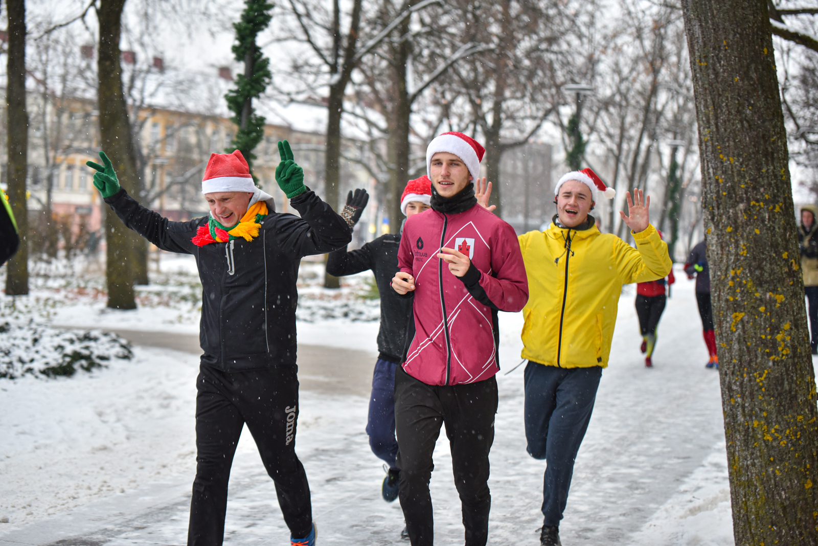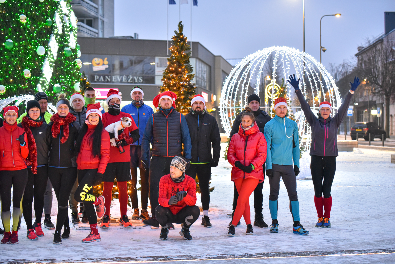 Iš čia būrys aistruolių startavo kalėdiniam bėgimui per miestą. Iš Laisvės aikštės bėgikai suko per rekonstruoti baigiamą Senvagę ir pagal Nevėžio upę Taikos alėja bėgo iki Kultūros ir poilsio parko. Jame apsukę ratą tuo pačiu maršrutu sugrįžo atgal, įveikę 10 kilometrų.