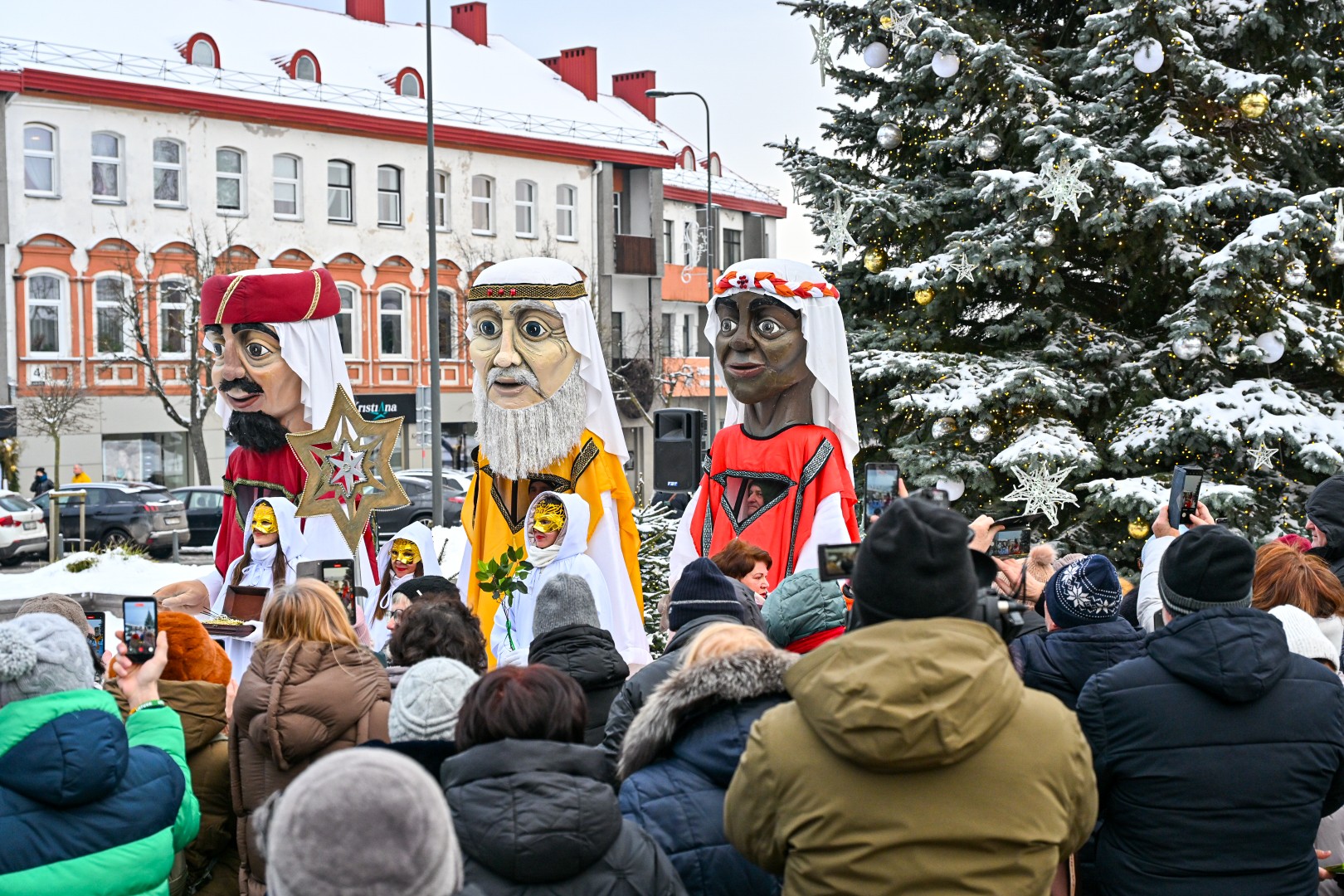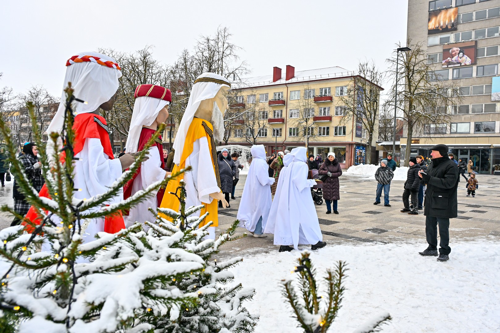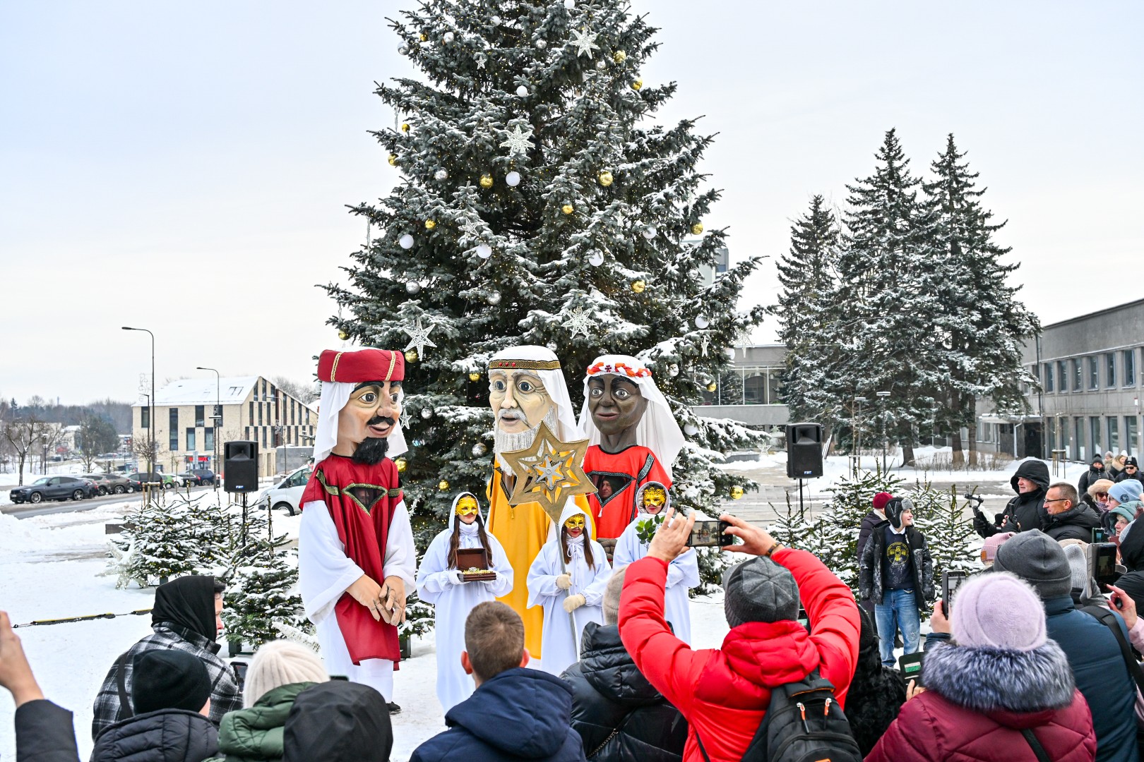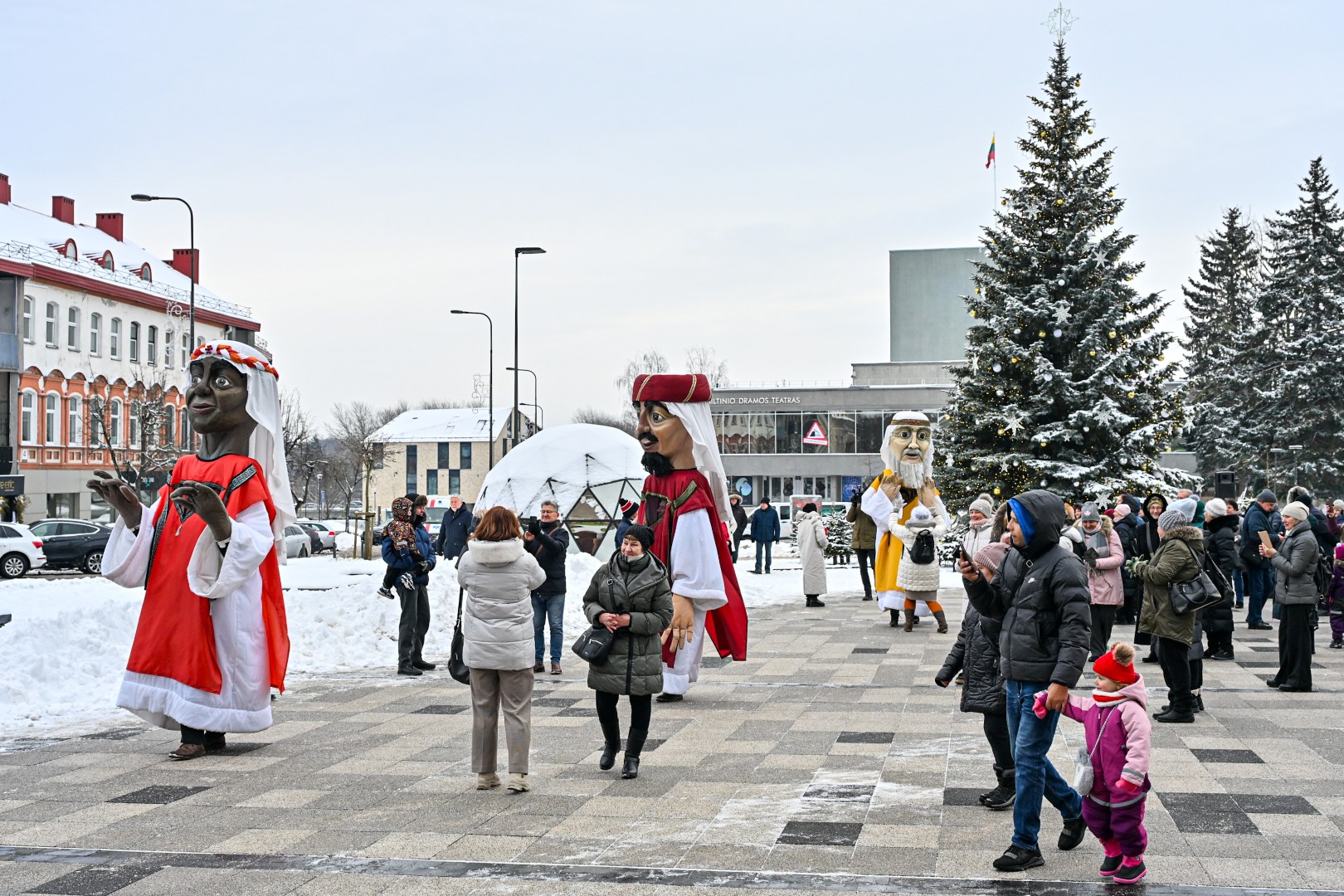 Įspūdingo ūgio karaliams pasiekus Kalėdų eglę, šalčio nepabūgę ir Laisvės aikštėje susirinkę panevėžiečiai išgirdo jų teatralizuotą sveikinimą.