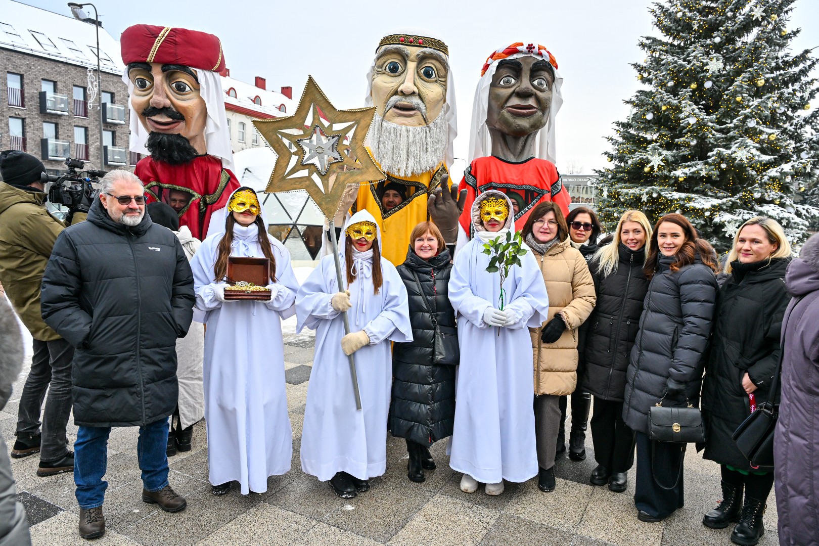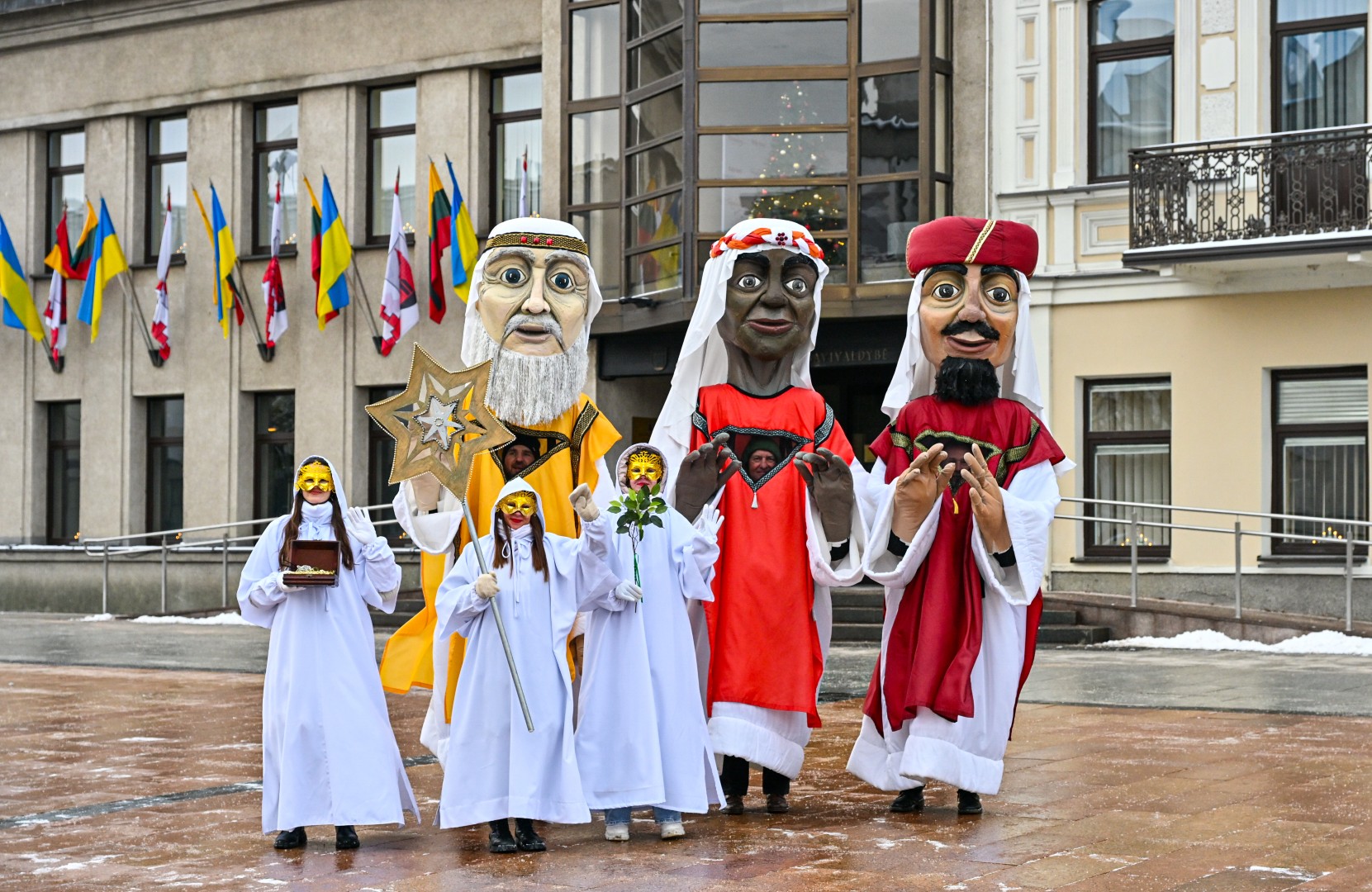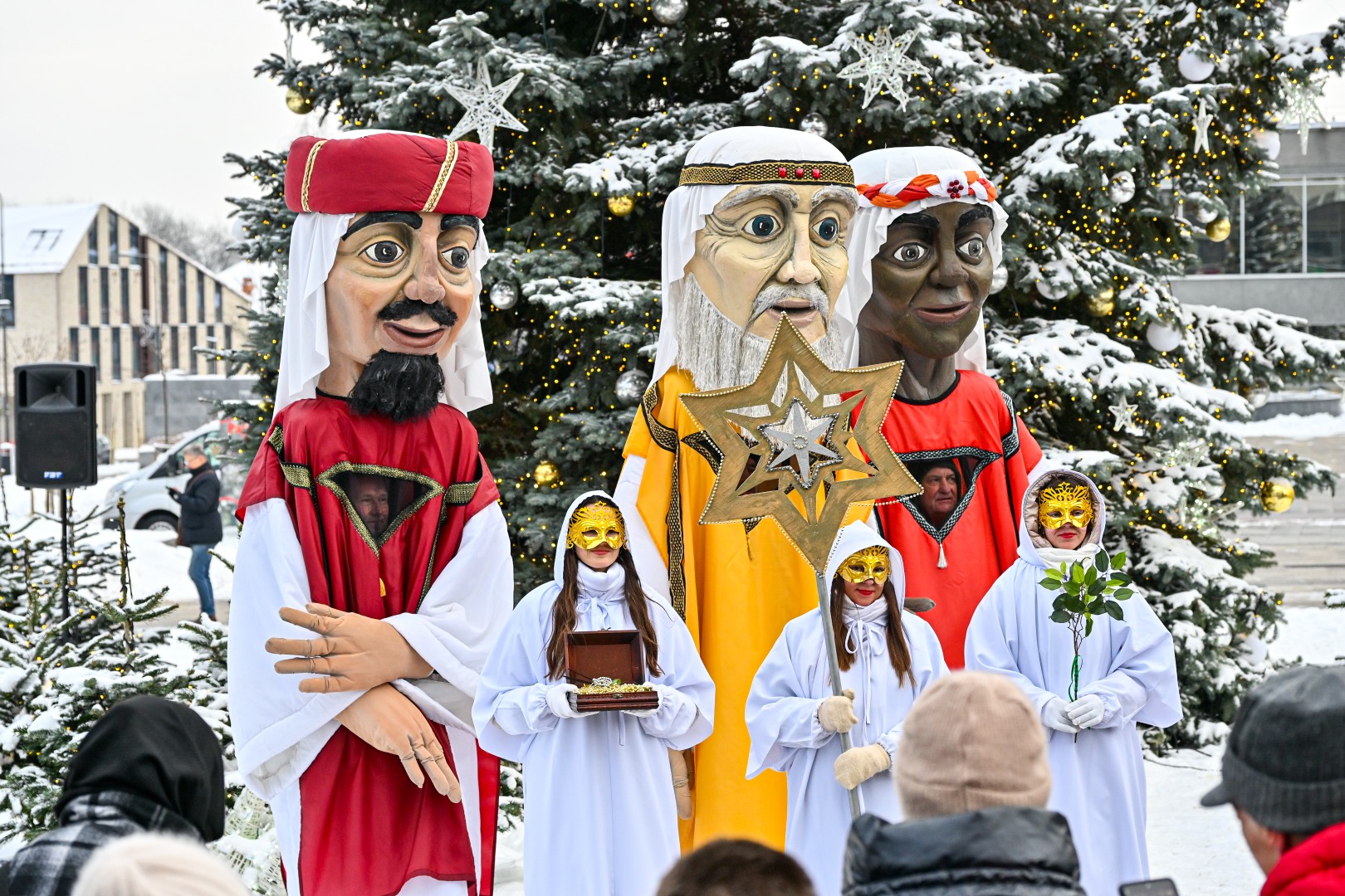 Įspūdingo ūgio karaliams pasiekus Kalėdų eglę, šalčio nepabūgę ir Laisvės aikštėje susirinkę panevėžiečiai išgirdo jų teatralizuotą sveikinimą.