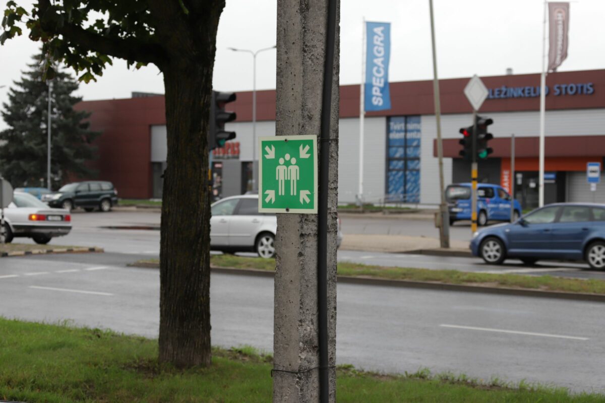 Ties Stoties ir S. Kerbedžio gatvių sankryža praeivių akys jau kurį laiką užkliūva už pritvirtintos ant stulpo žalios kvadrato formos lentelės su dviem vyriškomis figūromis ir baltomis rodyklėmis iš visų pusių į jas.