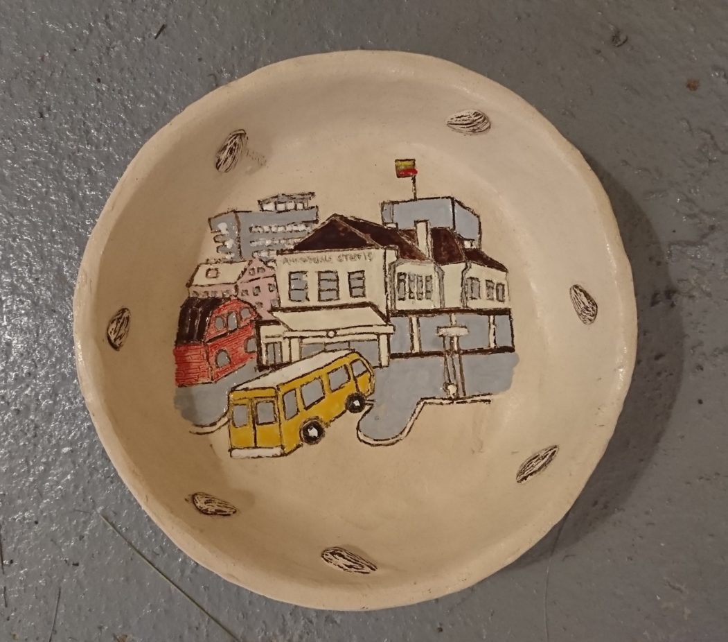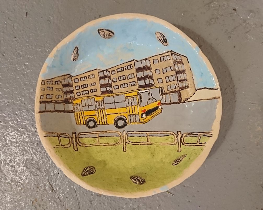 „Viename dubenėlių Panevėžiui pavaizdavau jo autobusų stotį, kurioje kiekvienas atostogas pradėdavau su linksma nuotaika, nes keliaudavau į Antalgę, pas senelius į sodybą“, – prisimena Giedrius.
