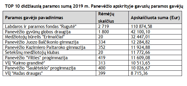Panevėžio mieste paramai skirta 652 tūkst. eurų, o Panevėžio rajone – 126 tūkst. eurų. Pasvalio ir Biržų rajonuose registruotiems paramos gavėjams gyventojai skyrė po 73 tūkst. eurų, Rokiškio rajone beveik 122 tūkst. eurų, o Kupiškio rajono paramos gavėjai sulaukė 41 tūkst. eurų.