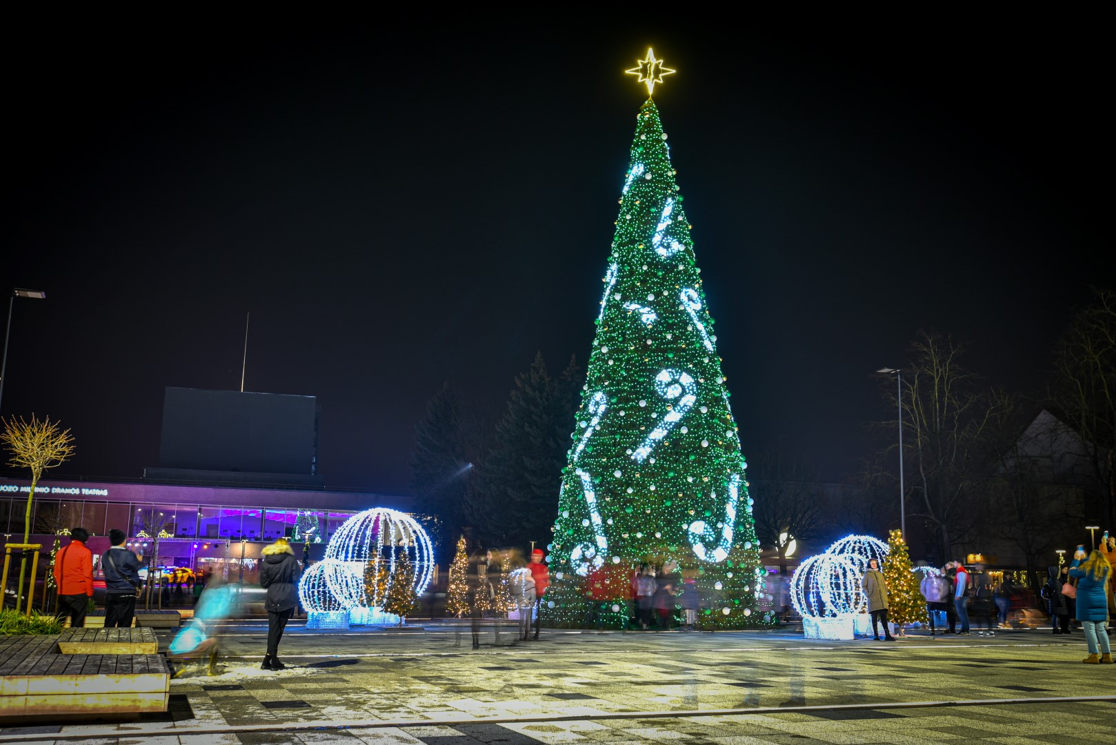 O 2023-uosius Panevėžys užbaigia ir 2024 m. pasitinka 13-os metrų natūralia žaliaskare, padabinta auksiniais ir sidabriniais žaisliukais bei raudonais kaspinais. Šioji sužibo net 15 tūkstančių lempučių.