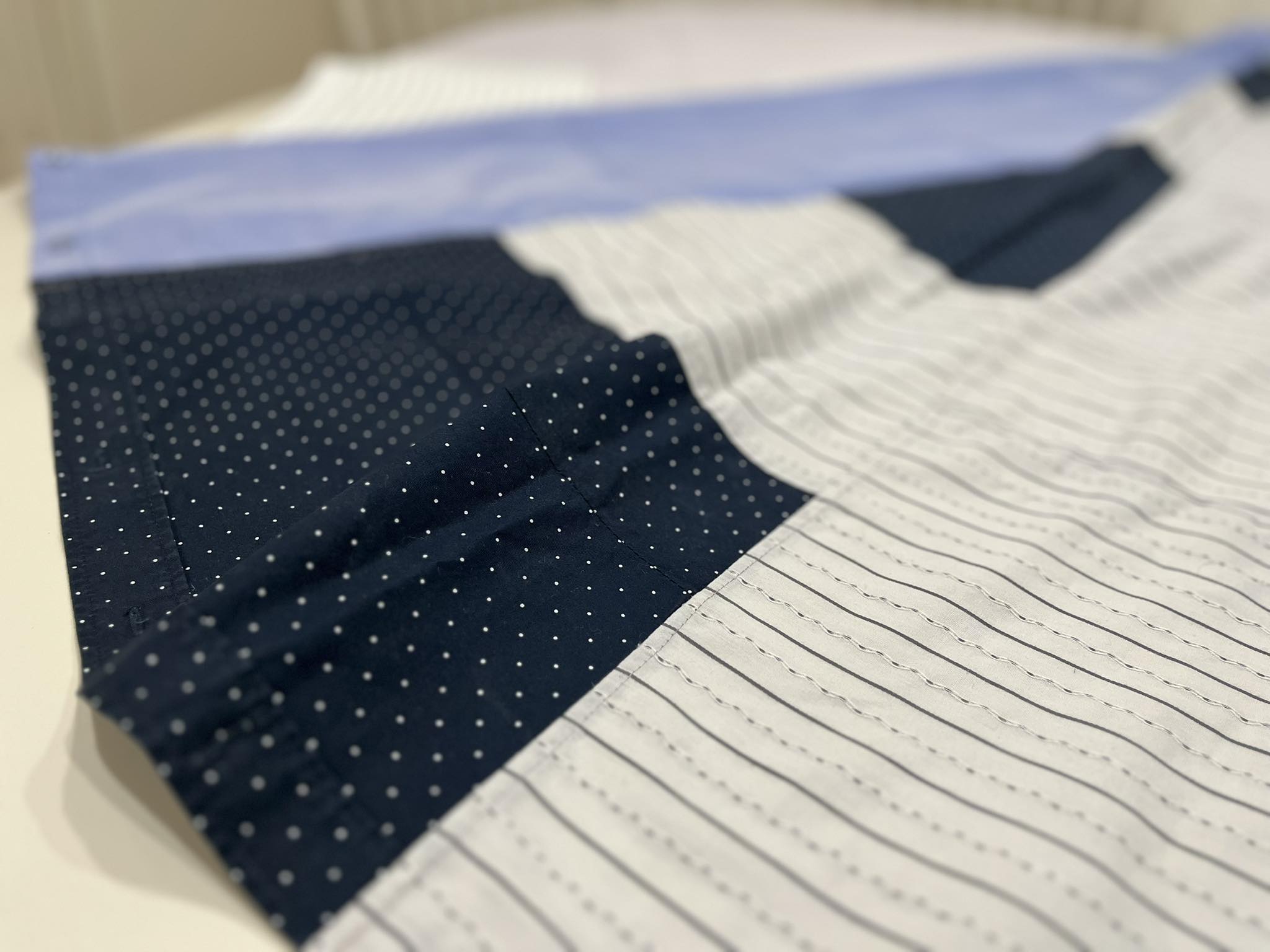 Anot jos, nesvarbu, koks šių drabužių dydis. Visi jie bus sukarpyti kvadratais bei stačiakampiais, paskui susiūti į vieną staltiesę.