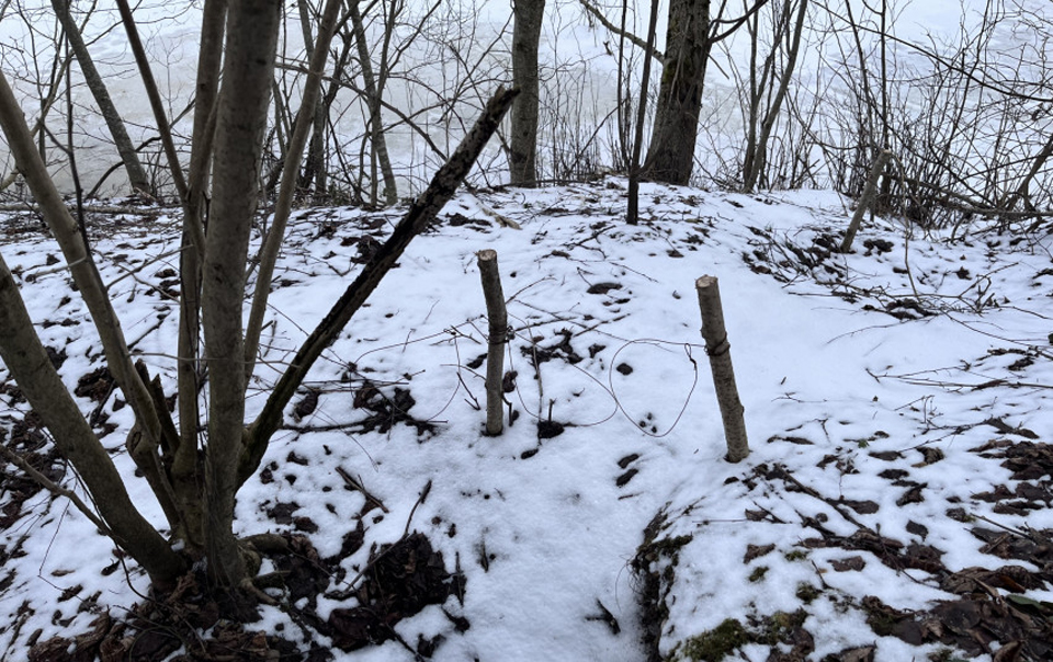 Nuvykę į nurodytą vietą ir žvalgydami miškelį, aplinkosaugininkai aptiko pastatytas kilpas, nuo kurių pėdsakai vedė į neįprastas gyvenamąsias patalpas netoliese. Patalpos, vadinamoji žeminė, buvo įrengtos po žemėmis kalno šlaite.