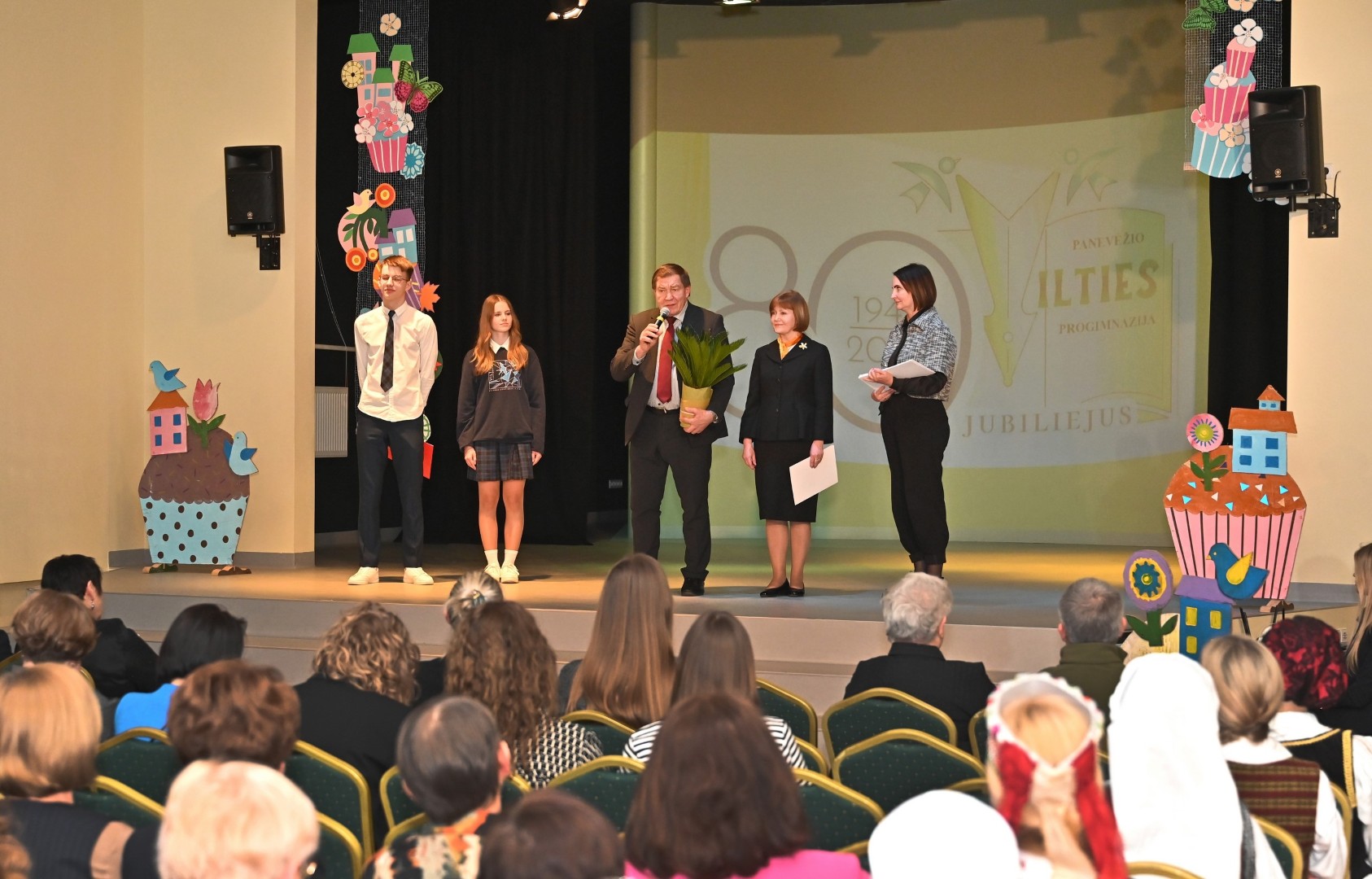 „Per aštuonis dešimtmečius Jūsų mokykla nuolat keitėsi, augo ir stiprėjo – nuo pokario mokyklos iki šiuolaikinės, vertybėmis grįstos progimnazijos. Kiekvienas etapas – tai istorija ir žmonių – mokytojų, mokinių, tėvų, darbuotojų – susitelkimo, atsidavimo ir pasitikėjimo rezultatas. Šiandien „Vilties“ progimnazija yra vieta, kurioje vaikai jaučiasi saugūs ir svarbūs, kur ugdymas grindžiamas bendrystės, atsakomybės, pagarbos ir sąžiningumo principais. Čia auga ne tik žingeidūs mokiniai, bet ir atsakingos, bendruomeniškos asmenybės – pasirengusios veikti, tobulėti ir kurti. Dėkoju visiems, kurie kūrė ir tebekuria mokyklos istoriją. Tegul ši sukaktis tampa gražiu įvertinimu už jau nuveiktus darbus ir stipriu įkvėpimu dar labiau stiprinti bendruomenę, ugdyti ateities kūrėjus ir saugoti tai, kas svarbiausia – žmogiškumą, pasitikėjimą ir viltį. Su švente, brangūs „Vilties“ žmonės!“, – sveikinimo žodį tarė laikinai Panevėžio miesto mero pareigas einantis Savivaldybės tarybos narys Petras Luomanas.