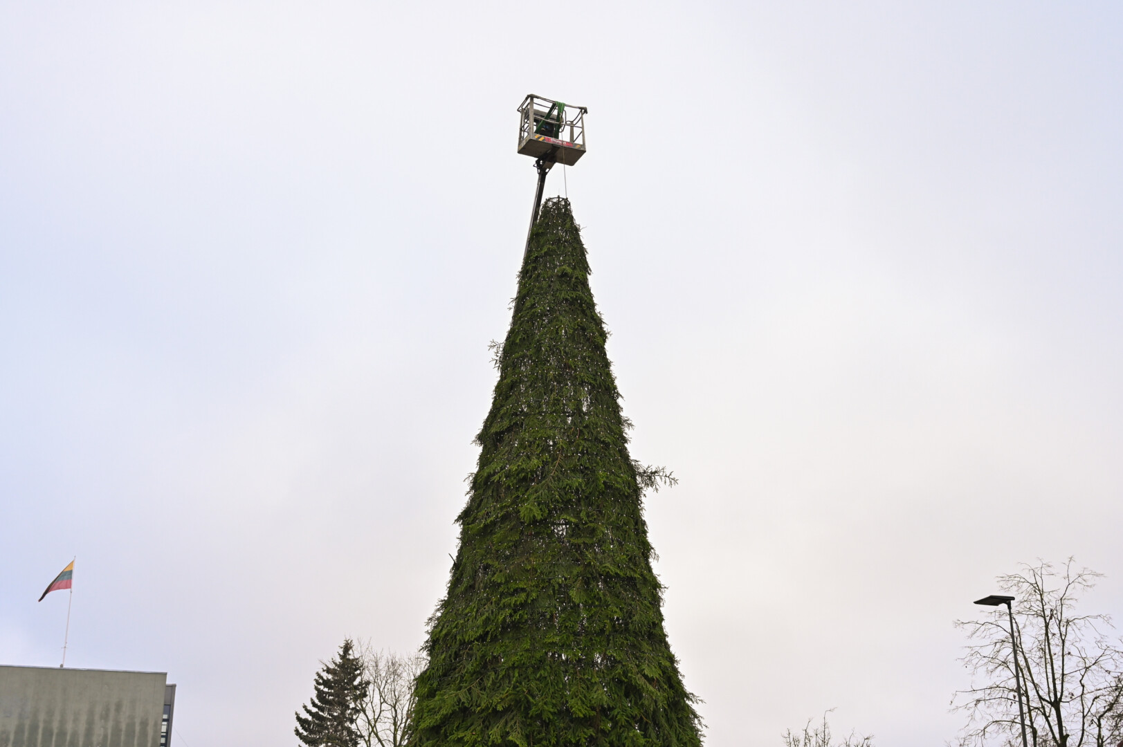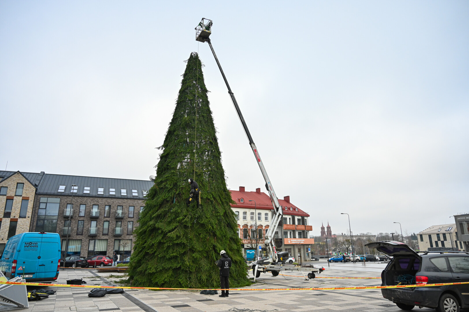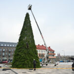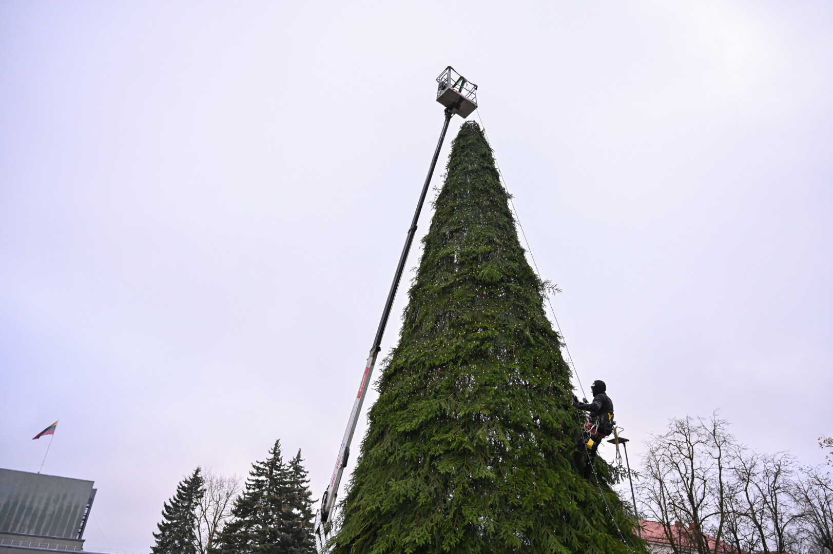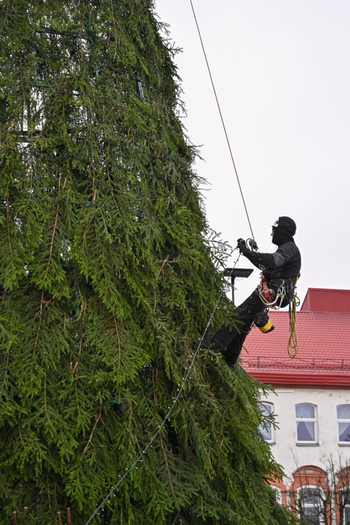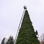 Laisvės aikštėje nuo antradienio darbuojasi kalėdinės eglės montuotojai.