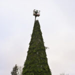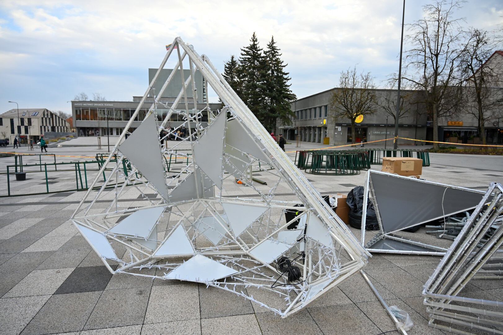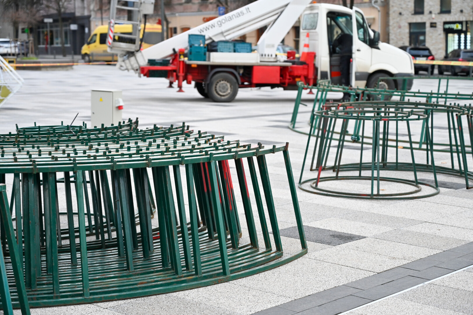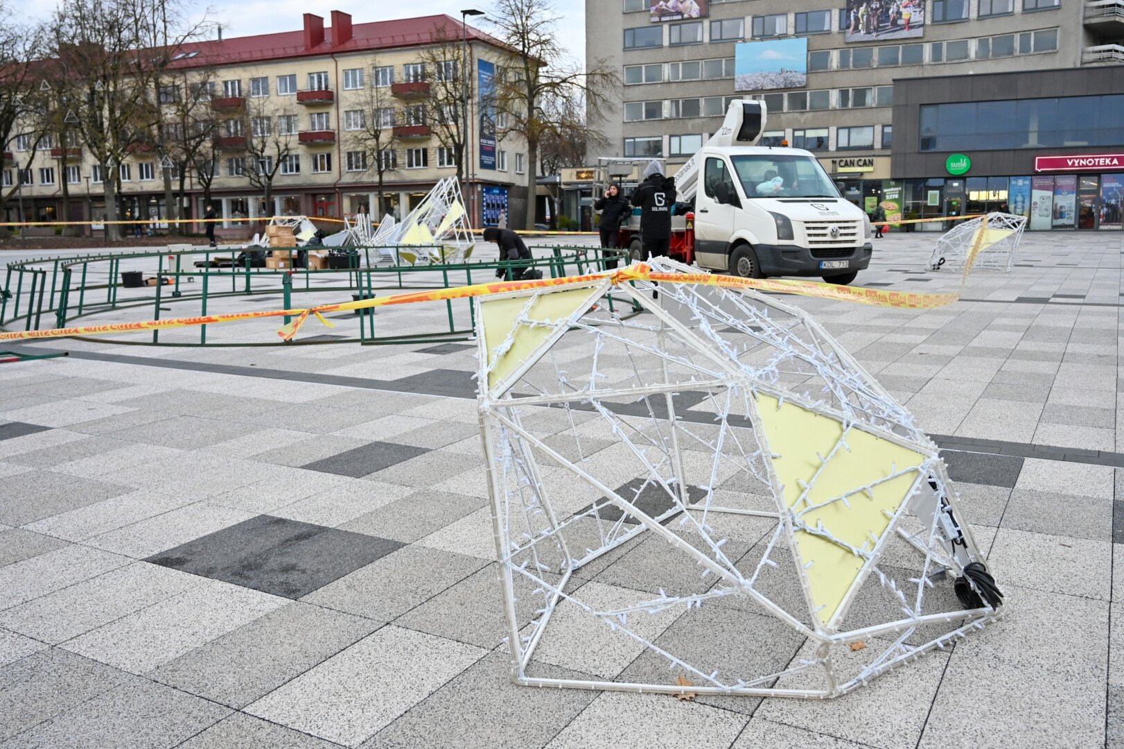 Laisvės aikštėje nuo antradienio darbuojasi kalėdinės eglės montuotojai.