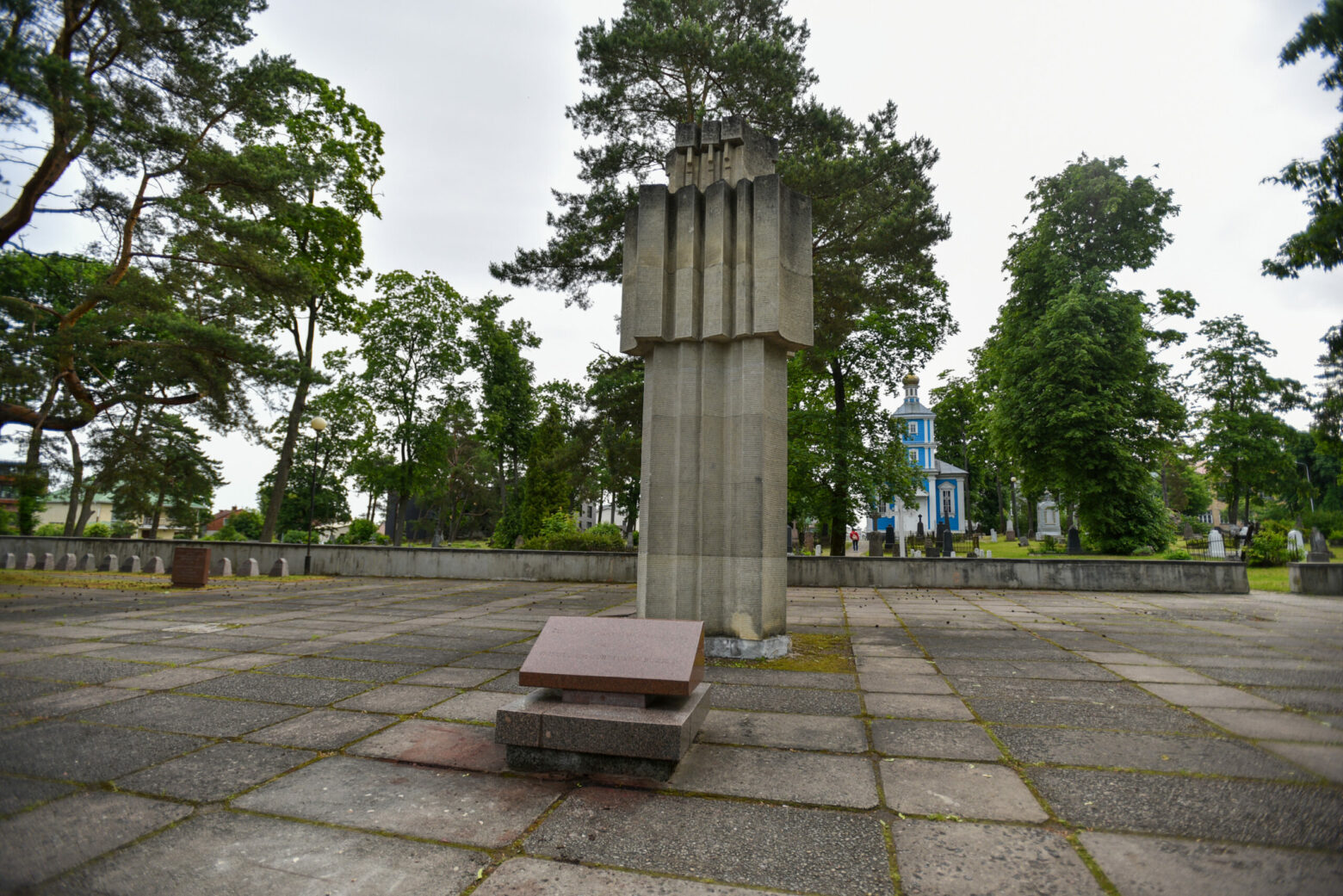Krekenavos gatvėje, karių kapinėse, rudos spalvos dažais apipilta akmeninė atminimo lenta žuvusiems tarybiniams kariams.