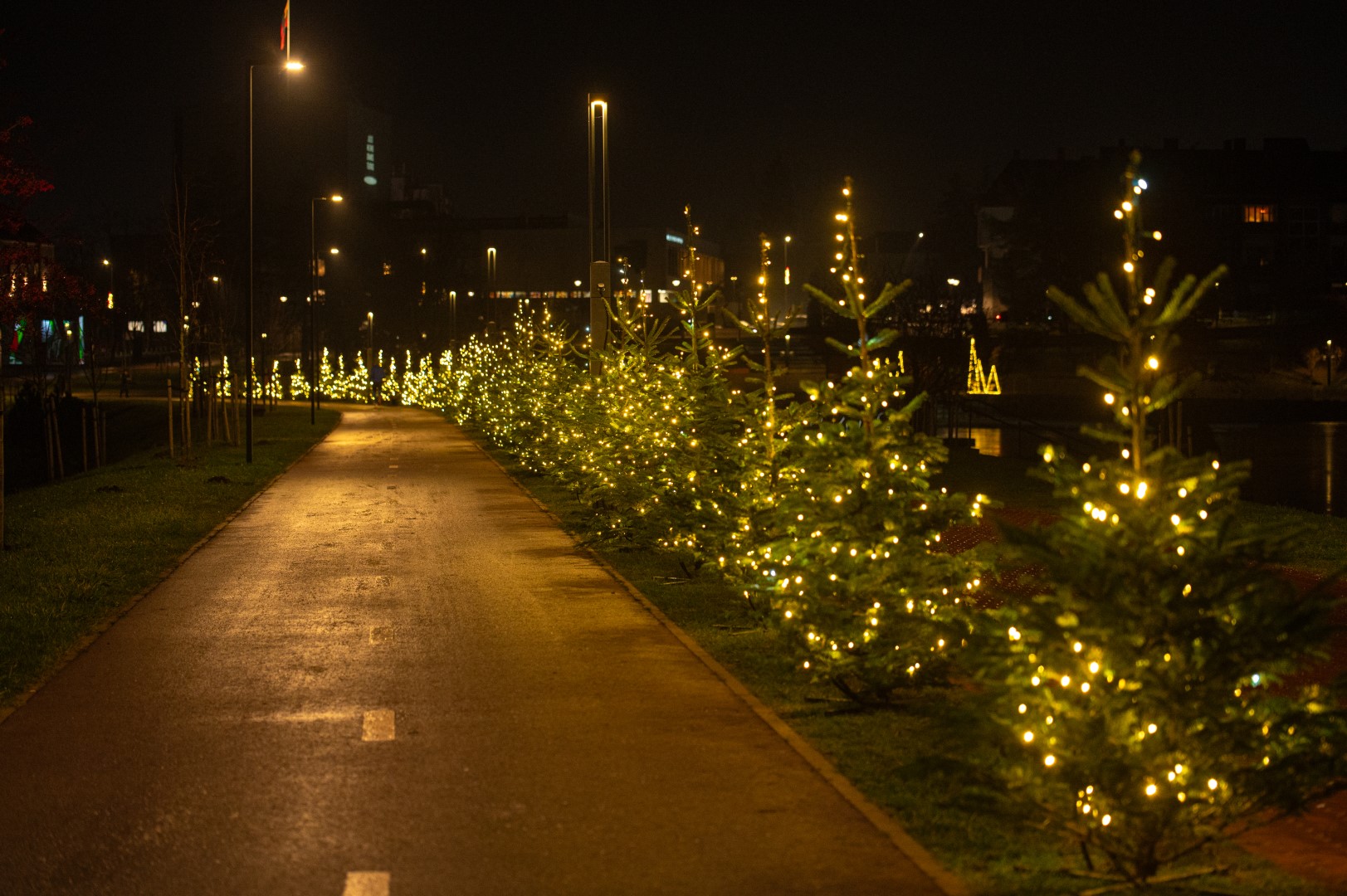 Kartu su eglutėmis apšviesti ir įėjimai į abu miesto parkus – Skaistakalnį nuo Muilo fabriko pusės bei Kultūros ir poilsio parką.