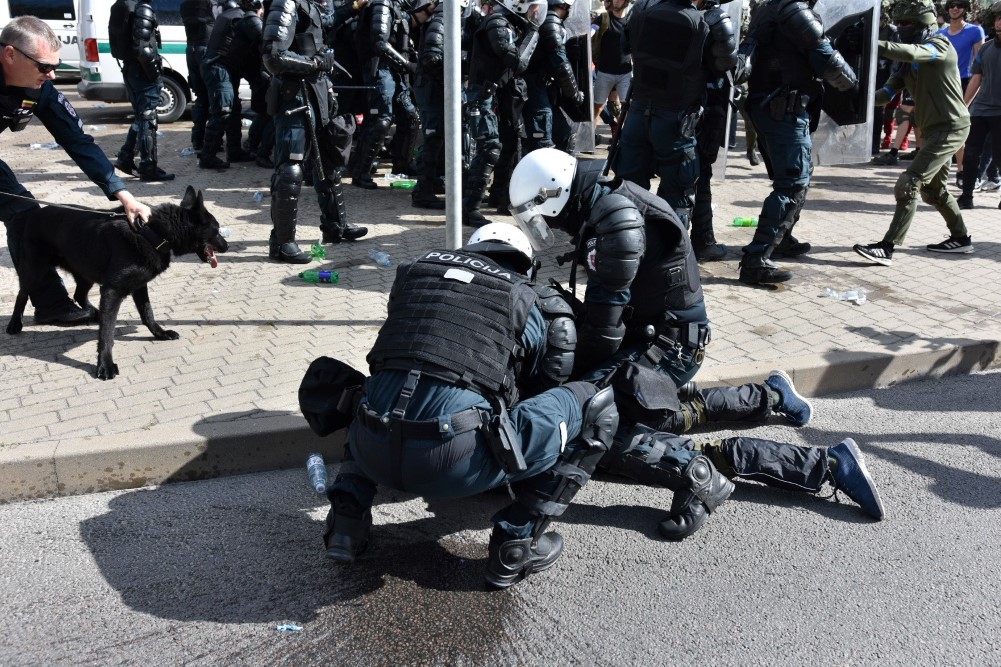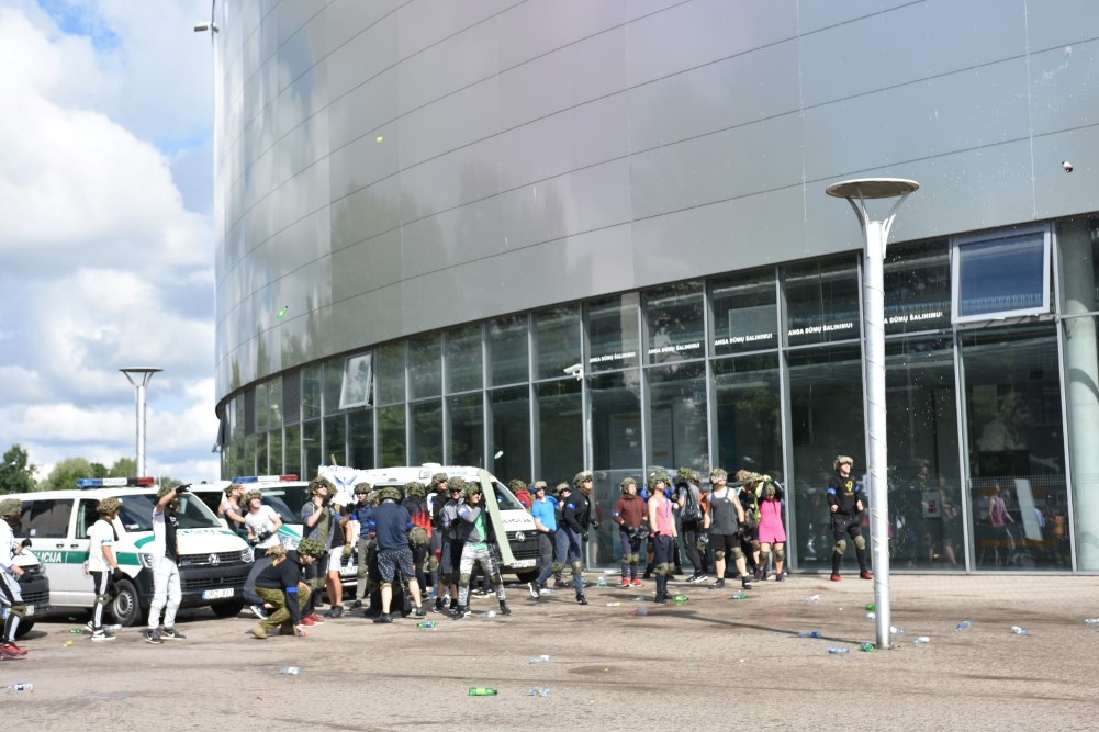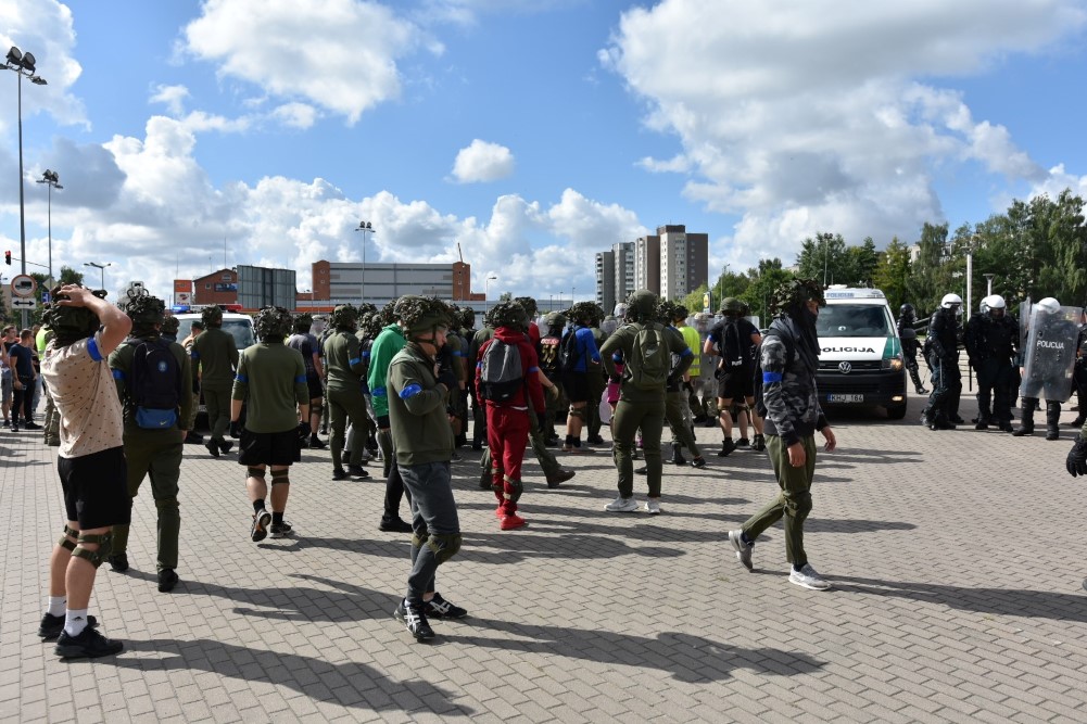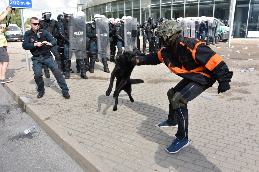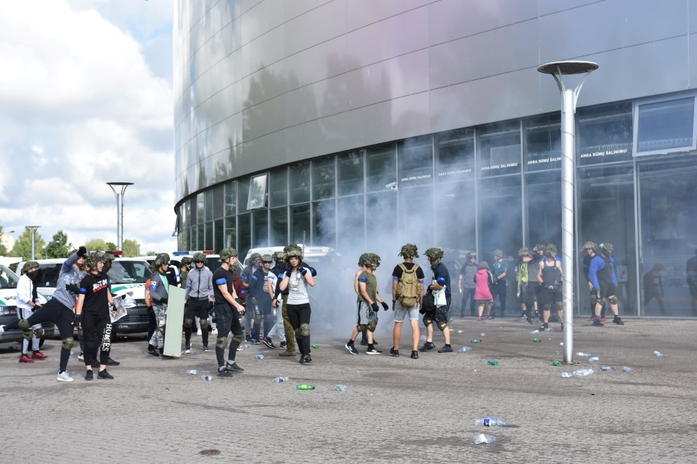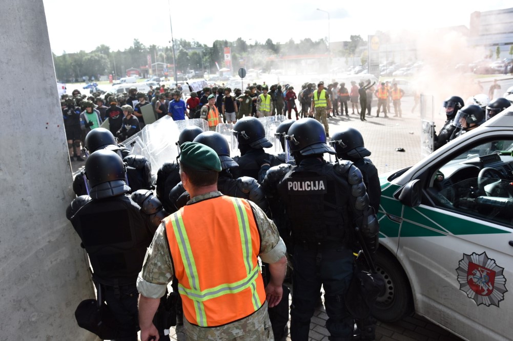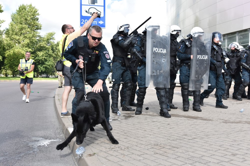 Gausios specialiųjų tarnybų ir karių pajėgos antradienio rytą sulėkė prie Panevėžio arenos malšinti įsisiautėjusios minios. Išstumti iš arenos vidaus, riaušininkai susibūrė lauke ir lengvai nepasidavė policijos pareigūnams.