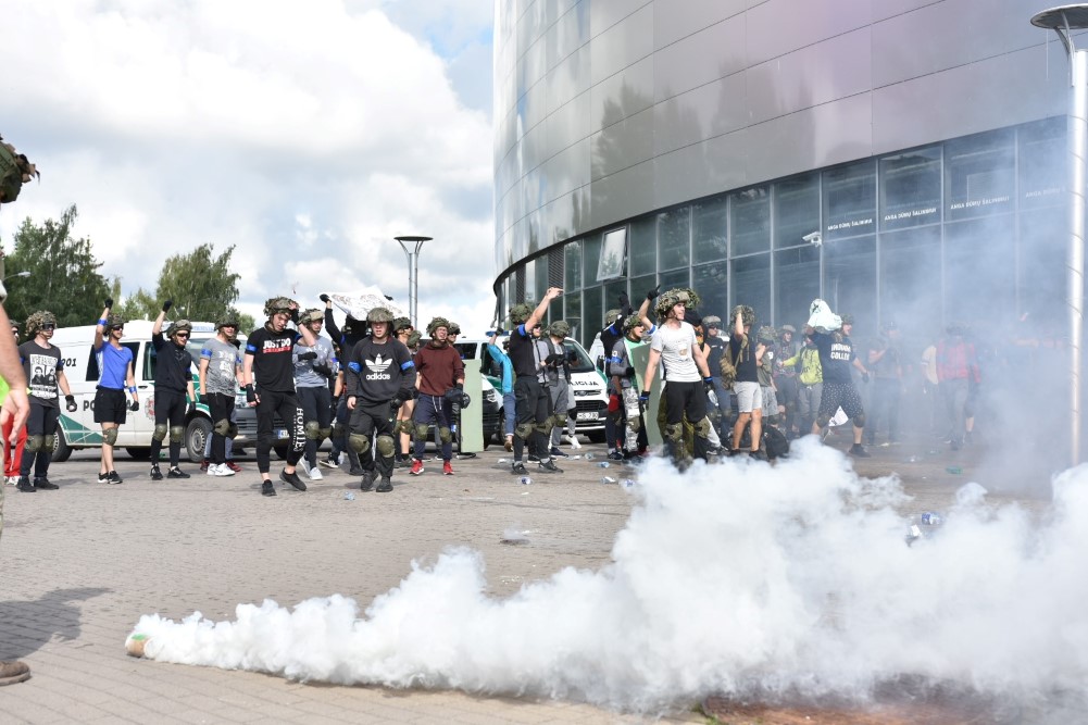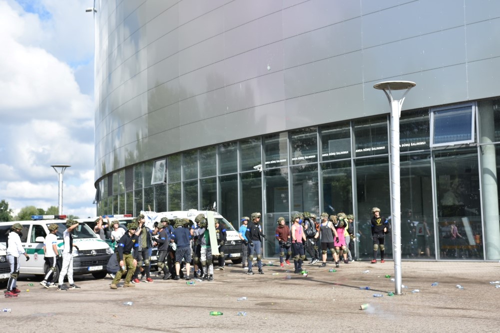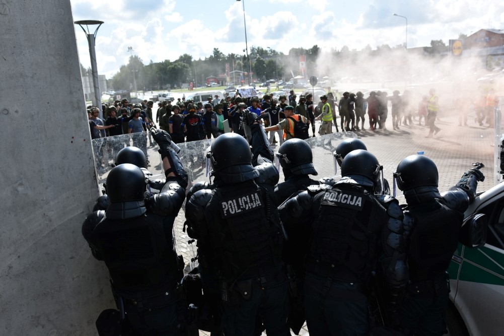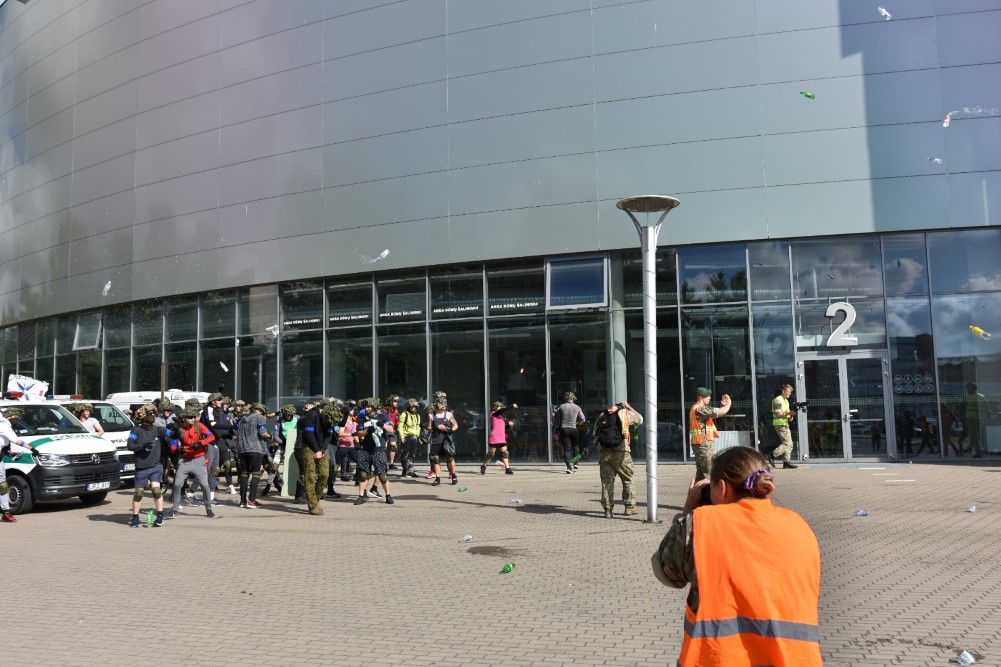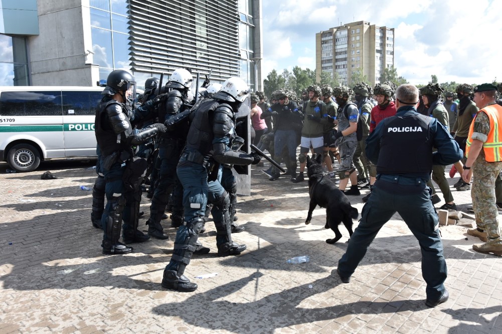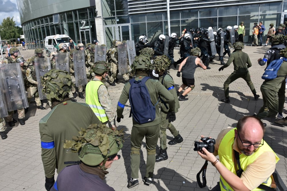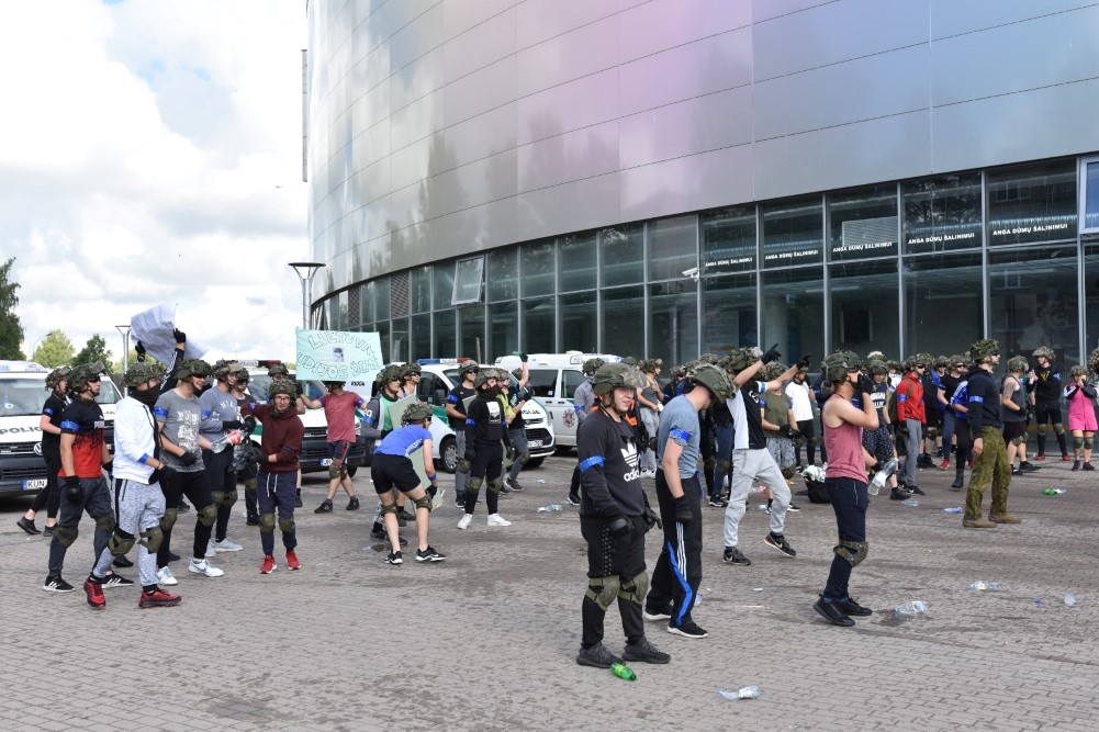 Gausios specialiųjų tarnybų ir karių pajėgos antradienio rytą sulėkė prie Panevėžio arenos malšinti įsisiautėjusios minios. Išstumti iš arenos vidaus, riaušininkai susibūrė lauke ir lengvai nepasidavė policijos pareigūnams.