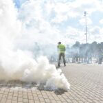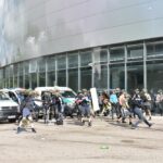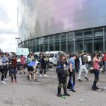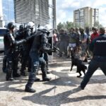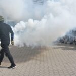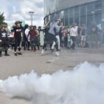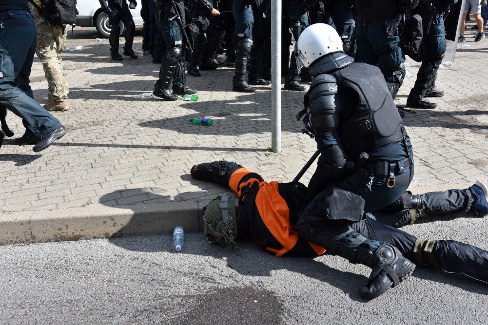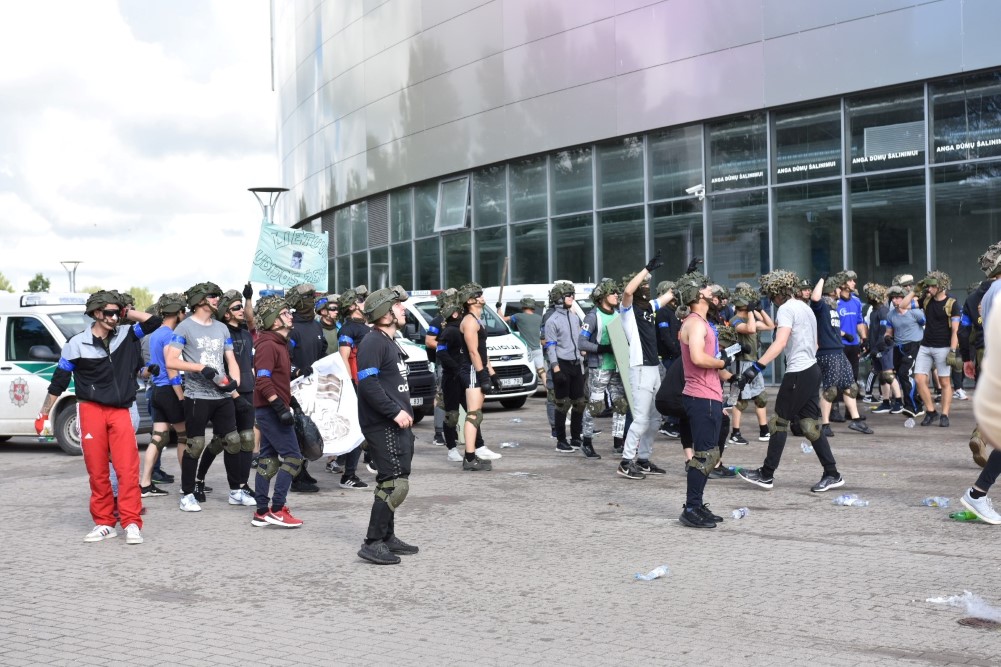 Policijai išprašius jaunuolius į lauką, emocingi sirgaliai nesiskirstė – susivieniję puolė pareigūnus. Į juos skriejo vandens buteliukai, vyko susistumdymai, paleisti dūminiai užtaisai. Policijos pareigūnai malšinti įsiaudrinusiai miniai į pagalbą pasitelkė ir tarnybinius šunis.