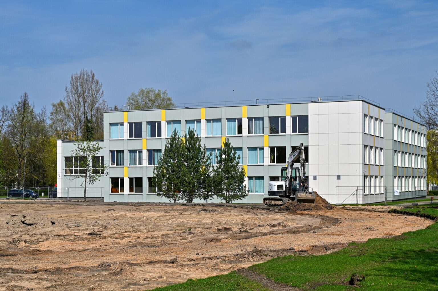 Panevėžio Beržų progimnazijos stadione darbuojasi statybininkai – įrengiant pripučiamą futbolo maniežą modernizuojama futbolo aikštė, netrukus prasidės komunikacijų įrengimo darbai, praneša miesto Savivaldybė.