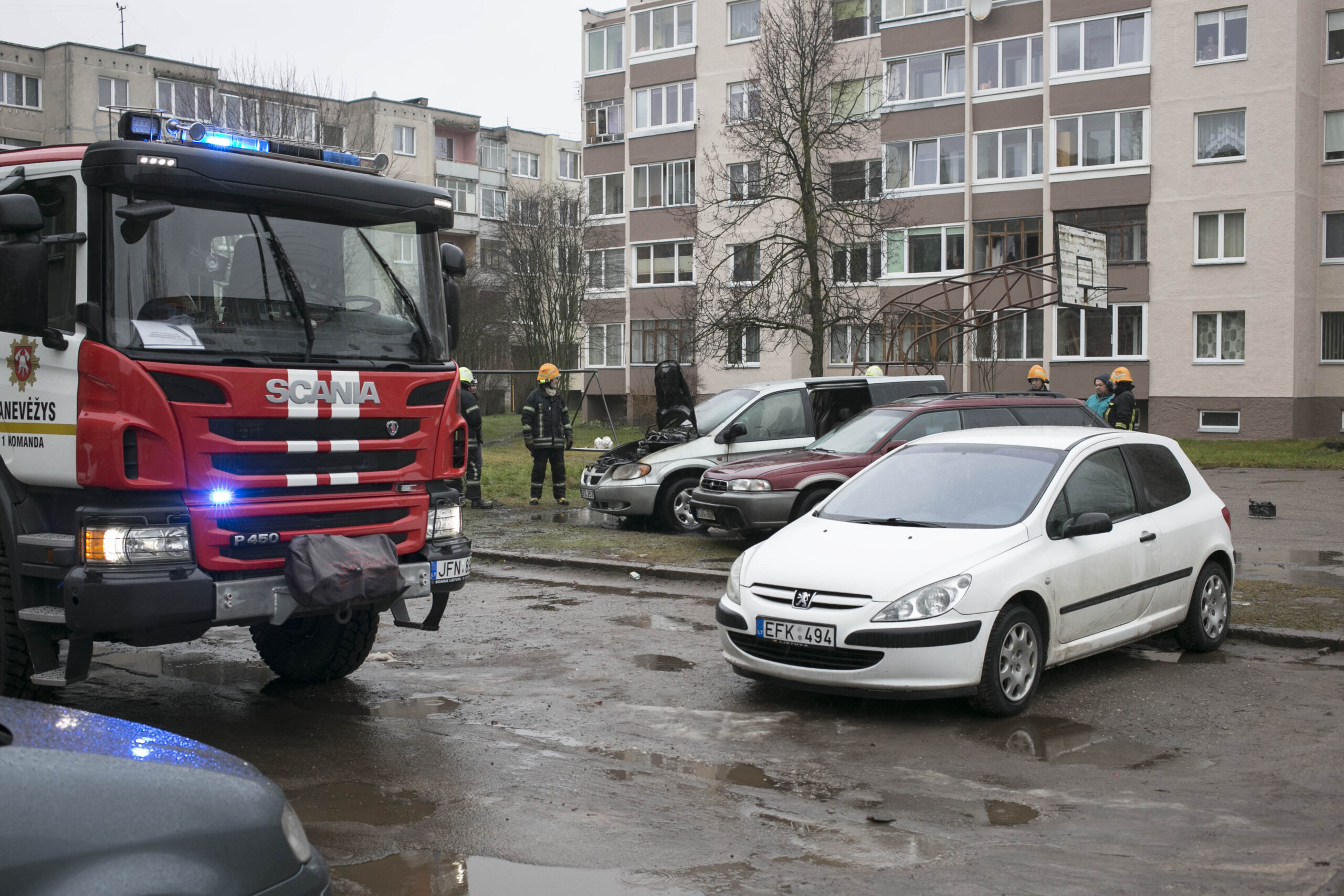 Panevėžyje, Klaipėdos g. užsiliepsnojus automobiliui ugniagesiai skubėjo gelbėti greta esančių transporto priemonių.