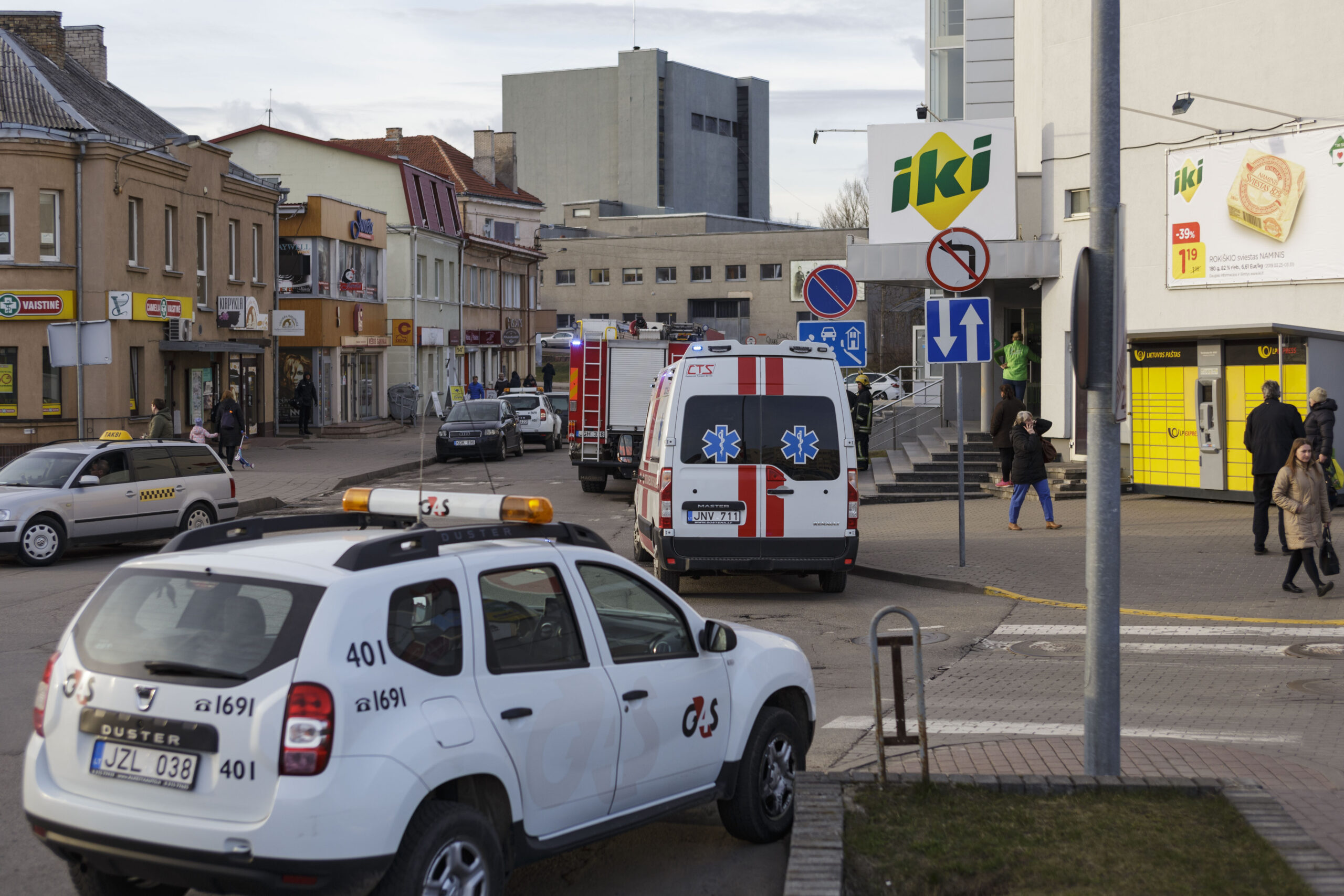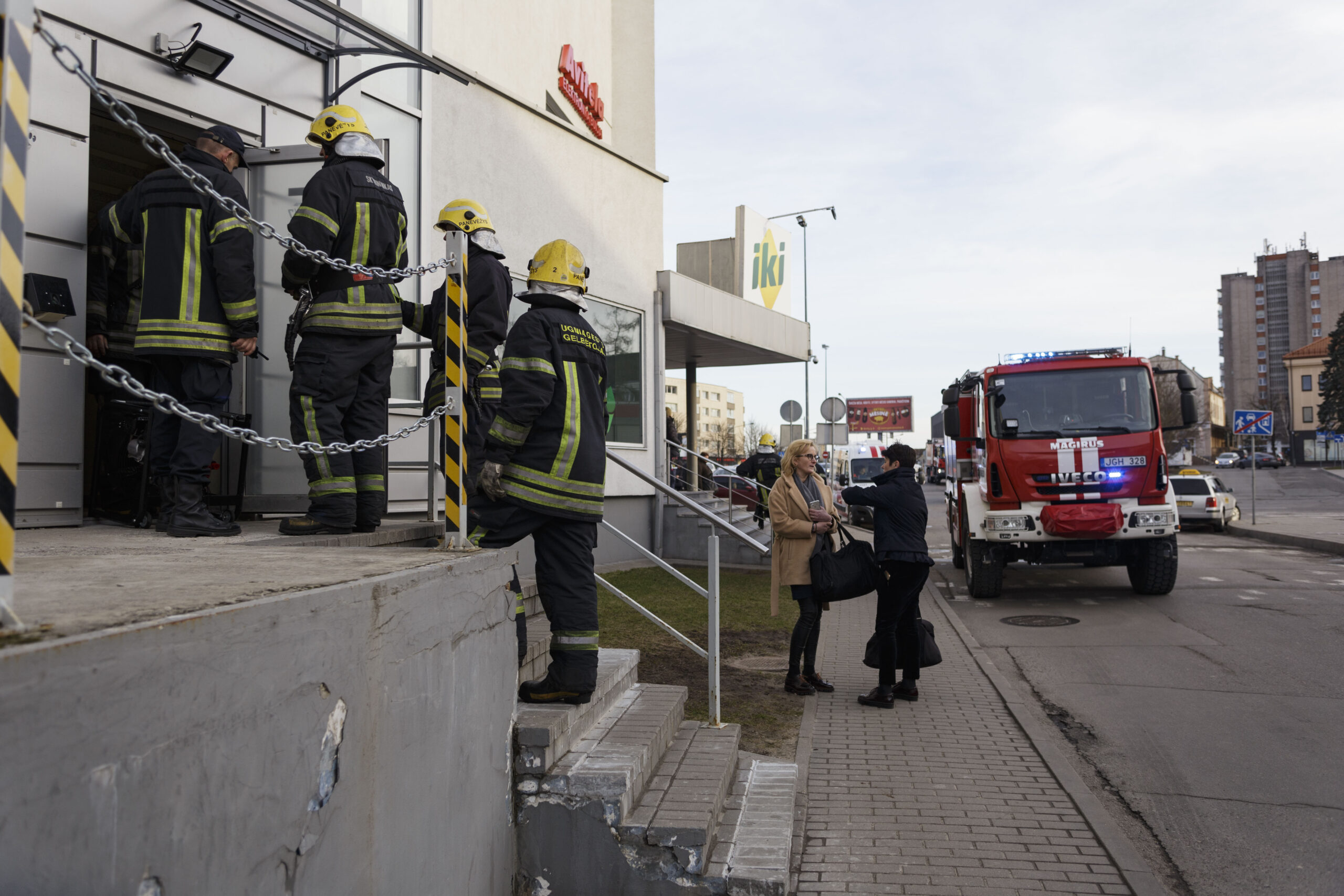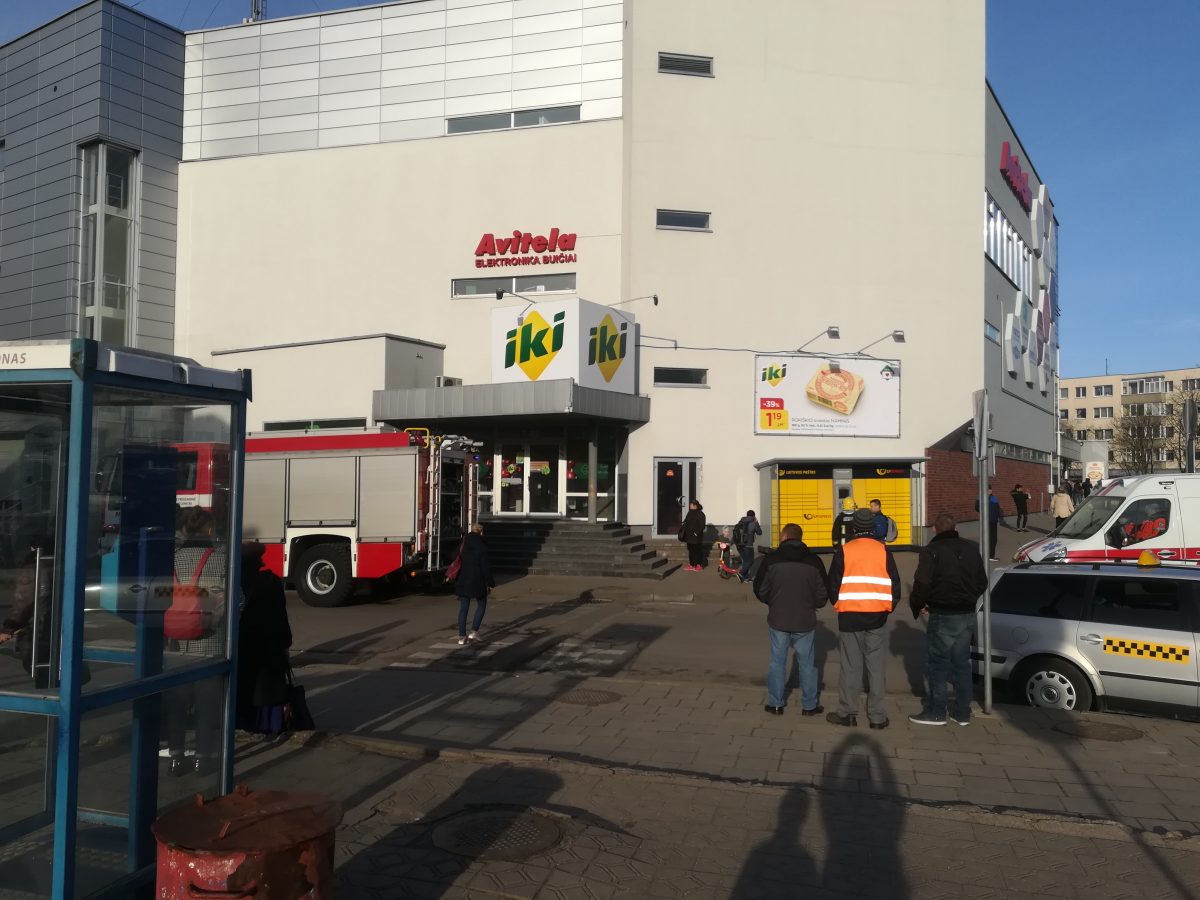 Pirkėjai į parduotuvę neįleidžiami, iš prekybos centro evakuojami žmonės.