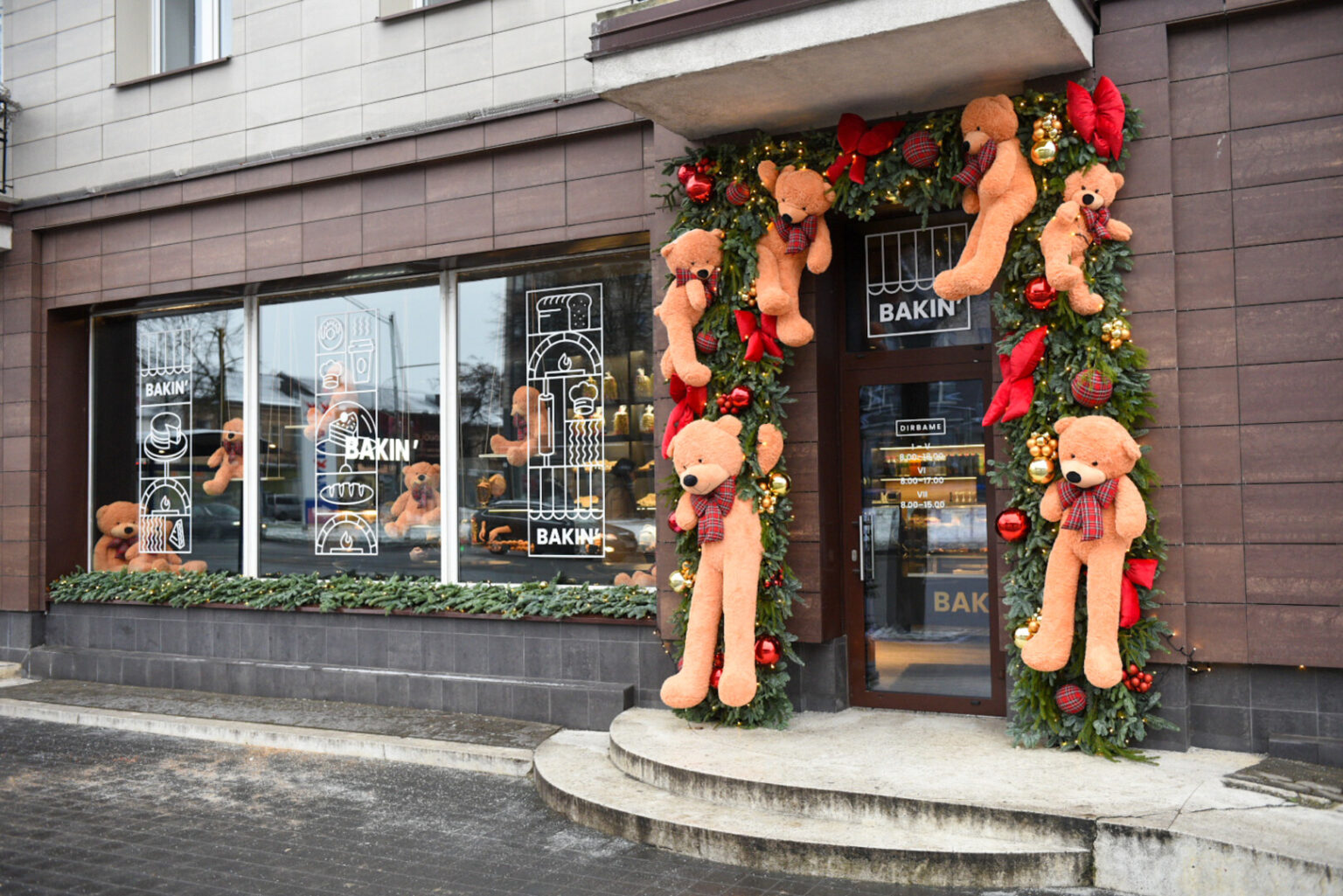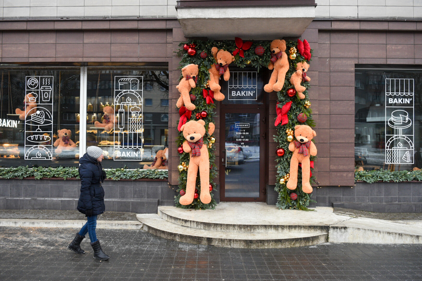 Kepyklėlės šeimininkės atnaujino įėjimo papuošimą vietoje pavogtųjų nupirkusios naujus meškius.