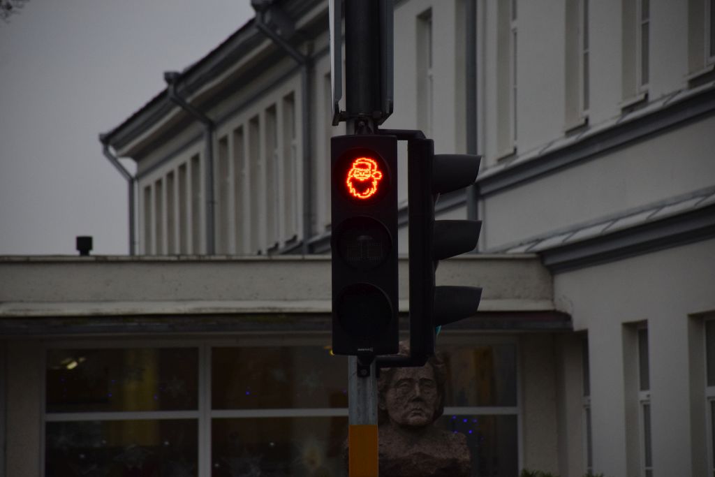 Pėsčiųjų perėją Respublikos gatvėje ties Juozo Balčikonio gimnazija reguliuojantis šviesoforas pasipuošė Kalėdoms – vietoje įprasto žalio signalo įsižiebia žaliaskarė eglė, o pėstiesiems eismą sustabdo raudonai nušvintantis Kalėdų senis.