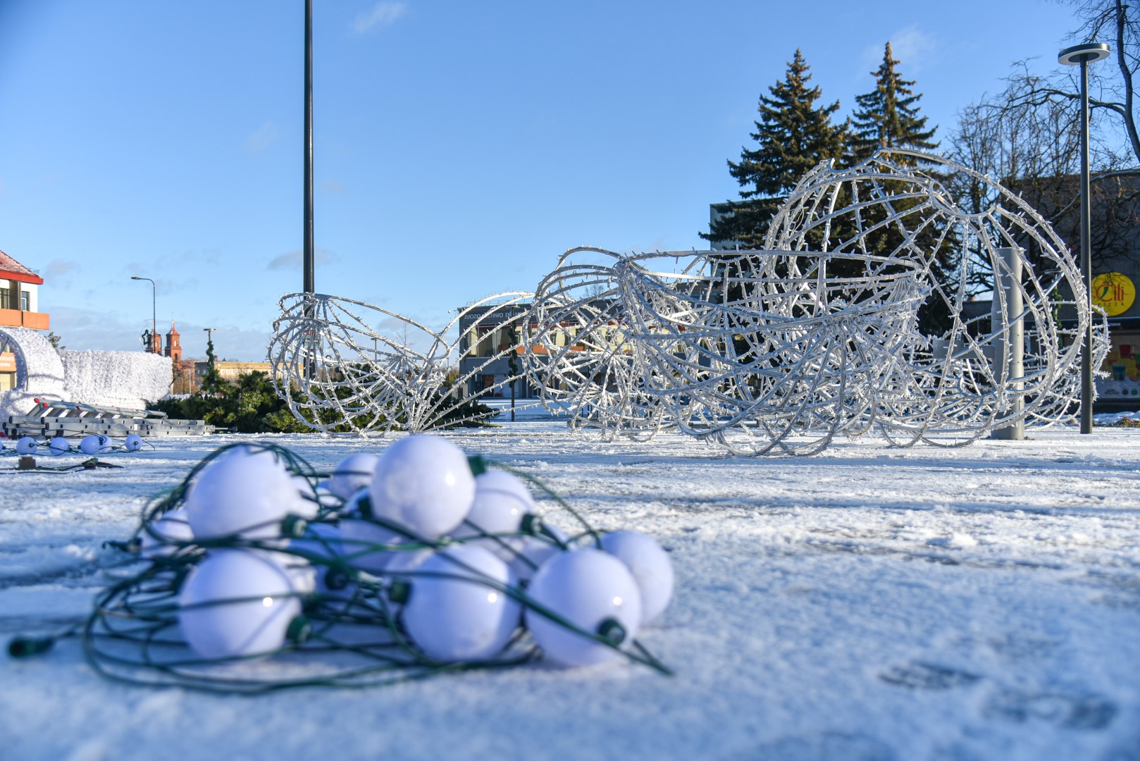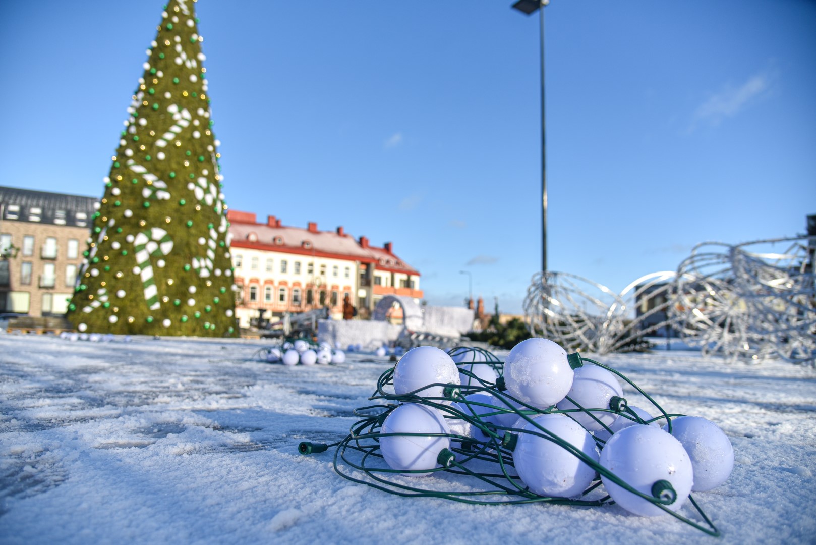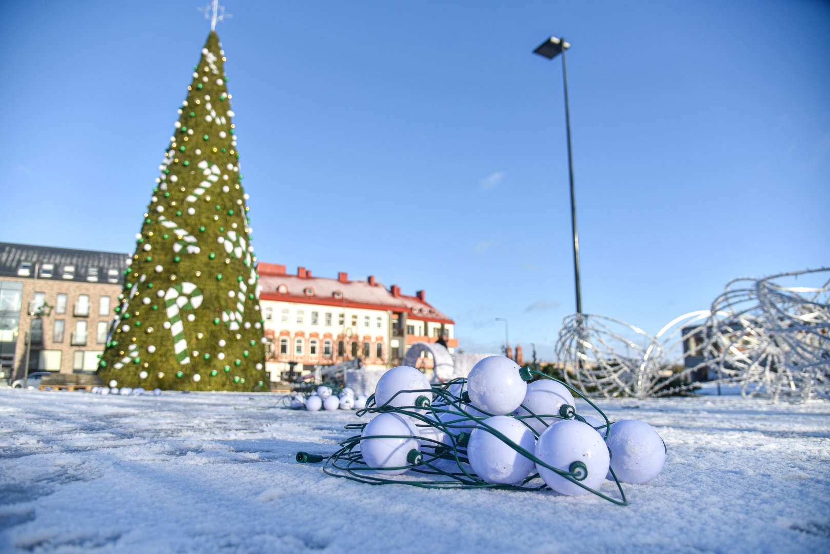 Už šiųmetį miesto kalėdinį grožį atsakinga įmonė „Lumidėja“ planavo pirmadienį imtis nupuošti ir pačią eglę, tačiau dėl oro sąlygų šį darbą nuspręsta perkelti į antradienį.