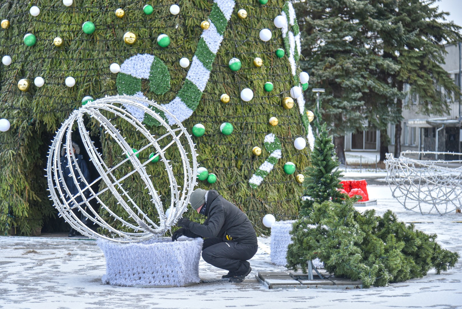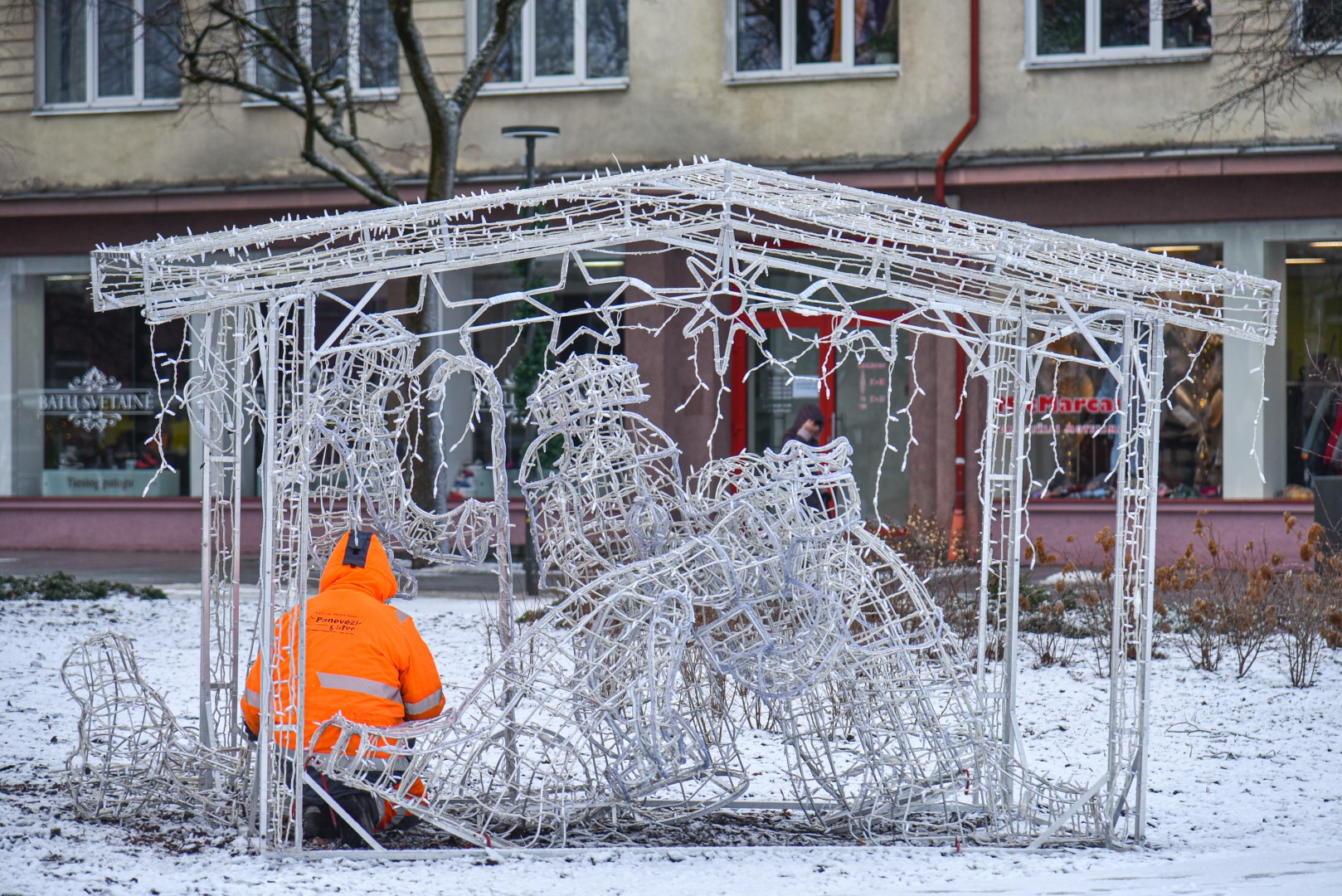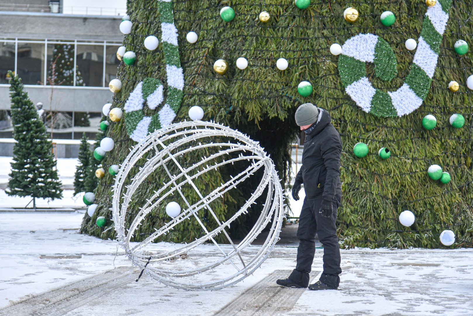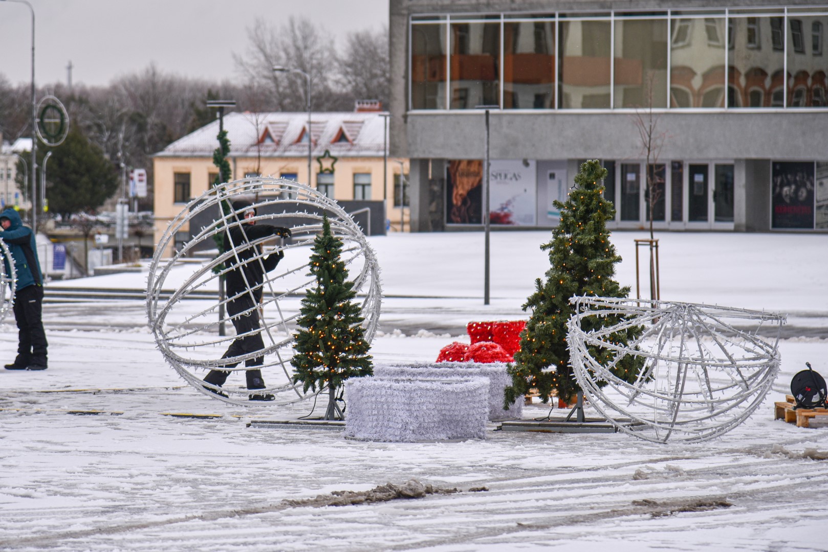 Už šiųmetį miesto kalėdinį grožį atsakinga įmonė „Lumidėja“ planavo pirmadienį imtis nupuošti ir pačią eglę, tačiau dėl oro sąlygų šį darbą nuspręsta perkelti į antradienį.