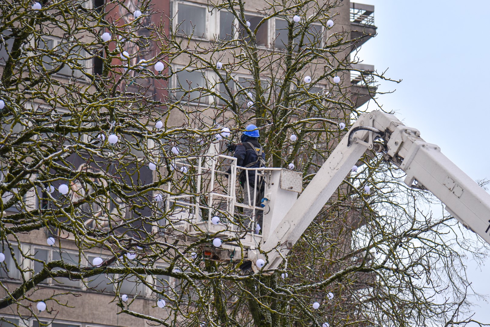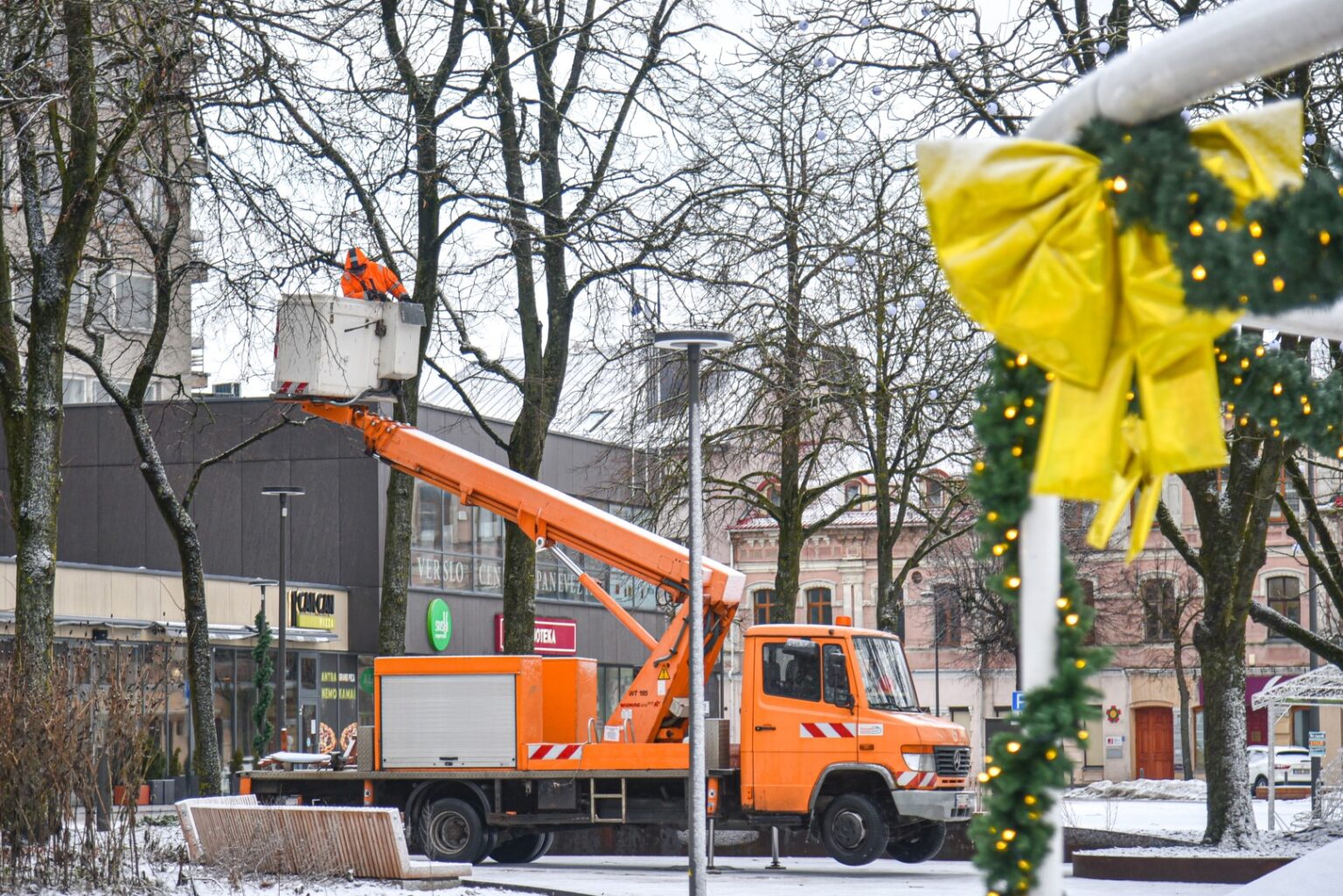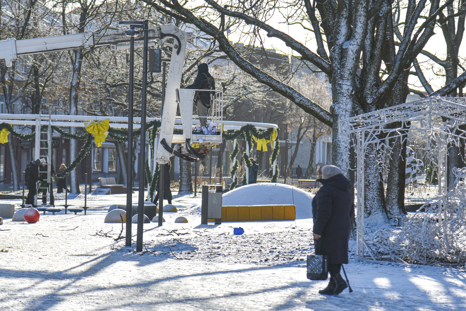 Aukštaitijos sostinė užbaigė šventinį laikotarpį. Pirmadienį nuo ryto Laisvės aikštėje pradėti nupuošti medžiai, nebeliks ir dekoracijų ant šviestuvų.