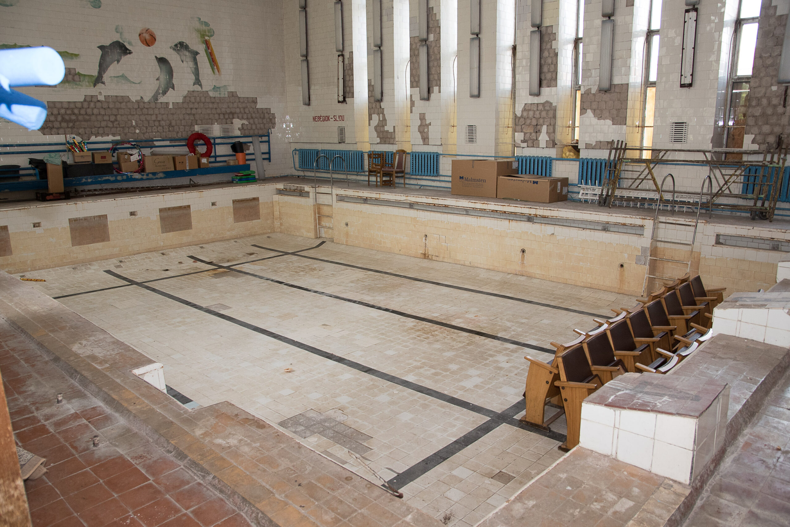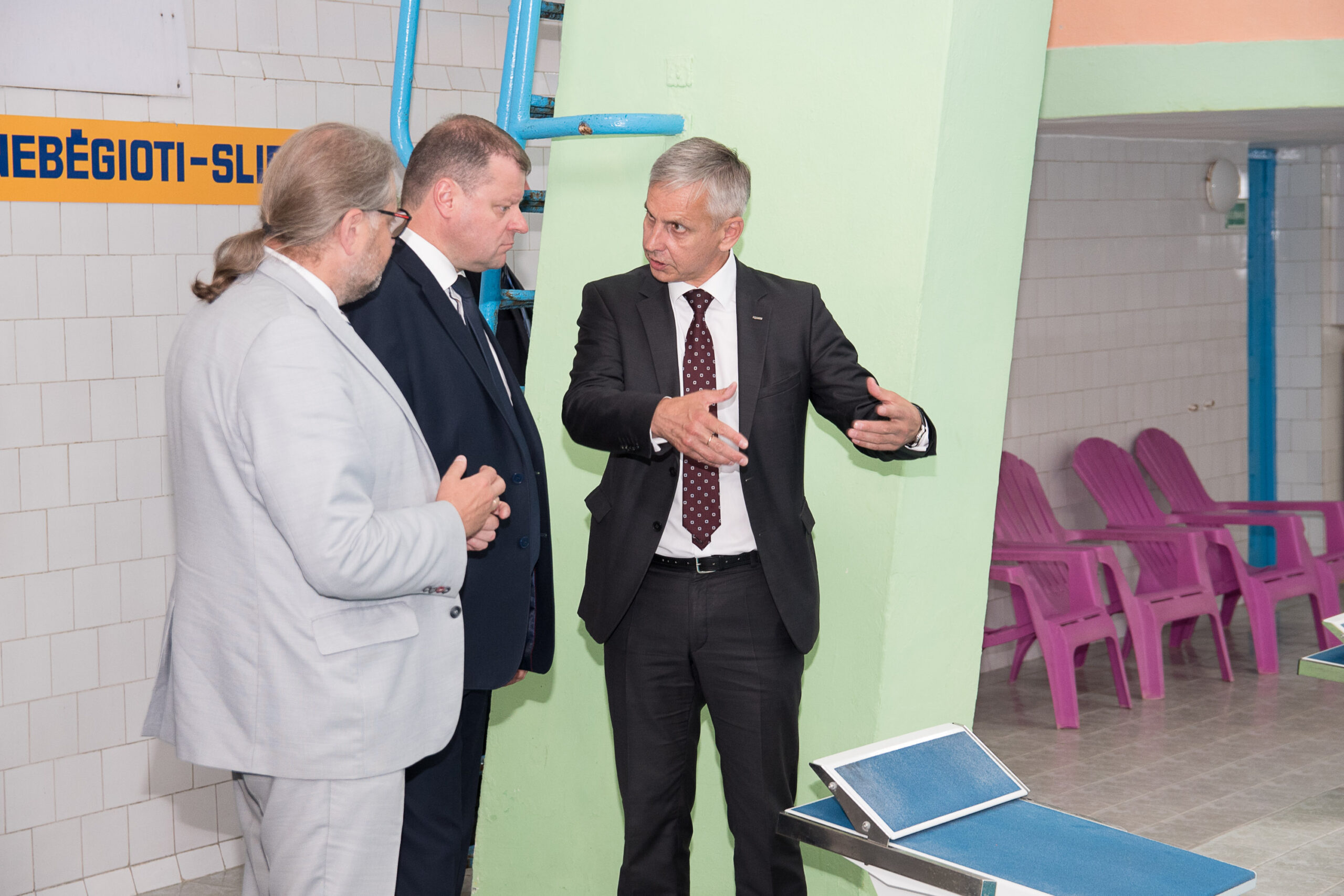 „Sporto kompleksas leidžia keliauti laiko mašina ir grįžti į gilų sovietmetį“, – įvertino premjeras, penktadienį apžiūrėjęs Panevėžyje „Aukštaitijos“ sporto komplekso baseinus.