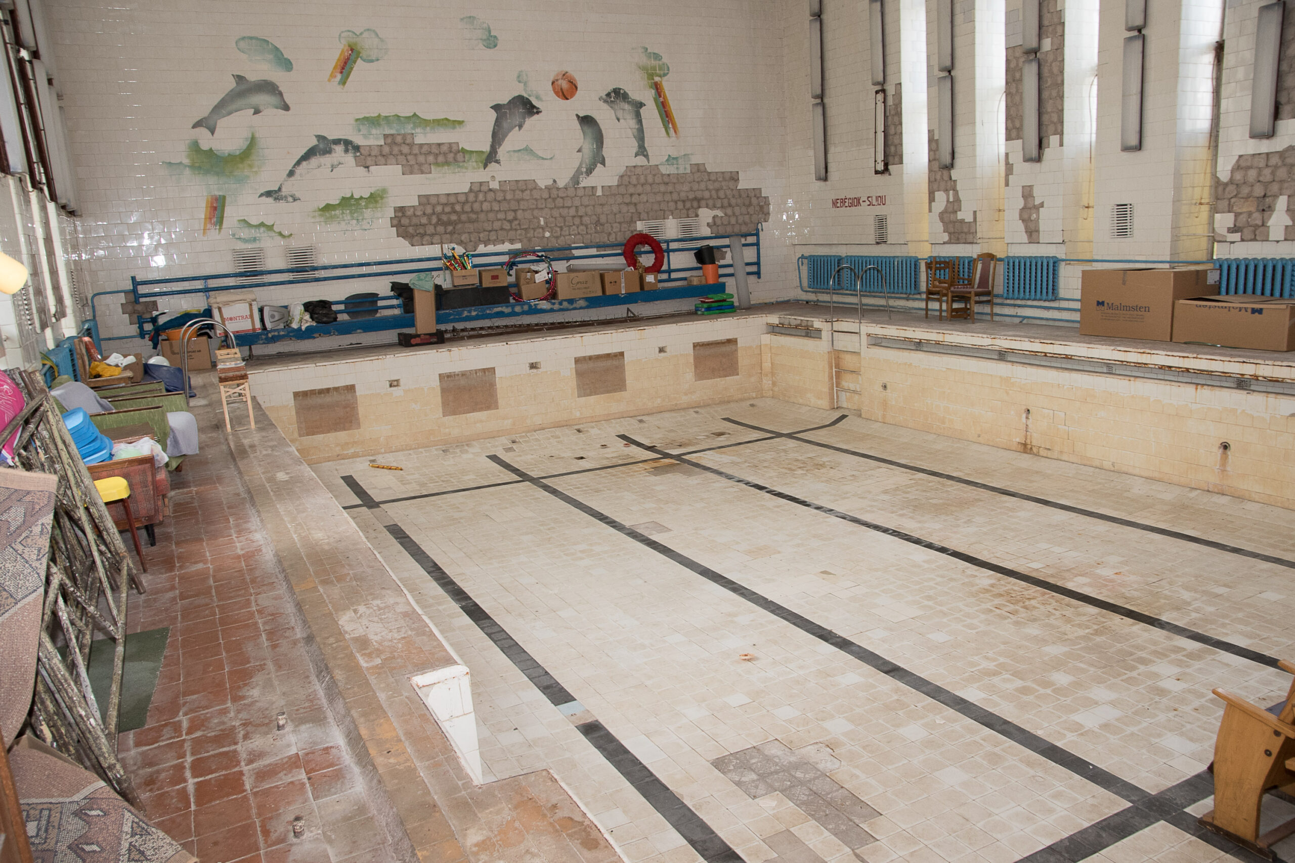 Daugiau nei prieš penkis dešimtmečius duris atvėrusiuose Panevėžio sporto rūmuose kadaise veikė net du baseinai – 25 ir 12 metrų. Pastarasis buvo skirtas vaikams mokyti plaukti. Dabar jau bene dvidešimt metų čia kojos nekelia ne tik lankytojai, bet ir darbuotojai. Mažasis baseinas virtęs griuvėsiais.