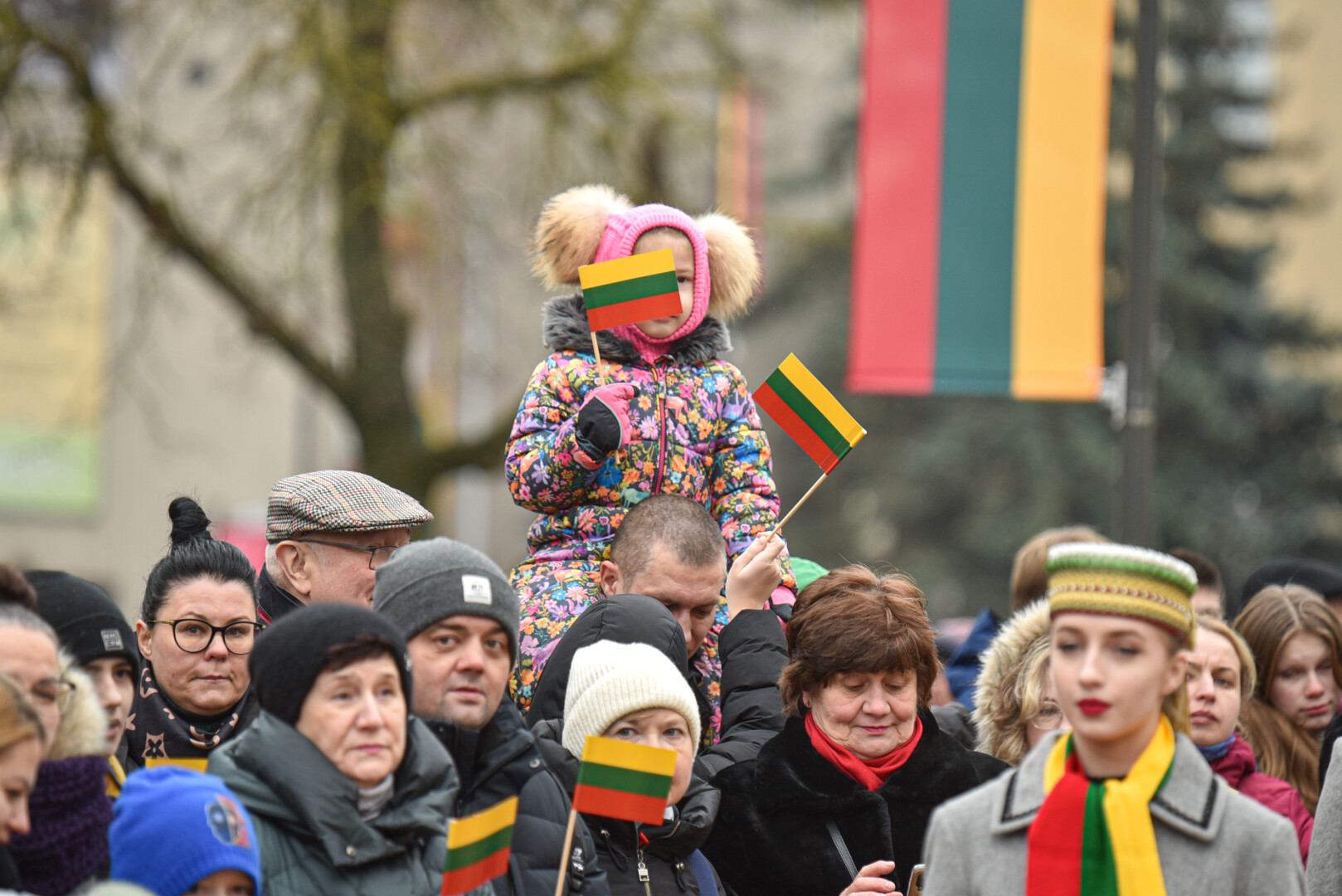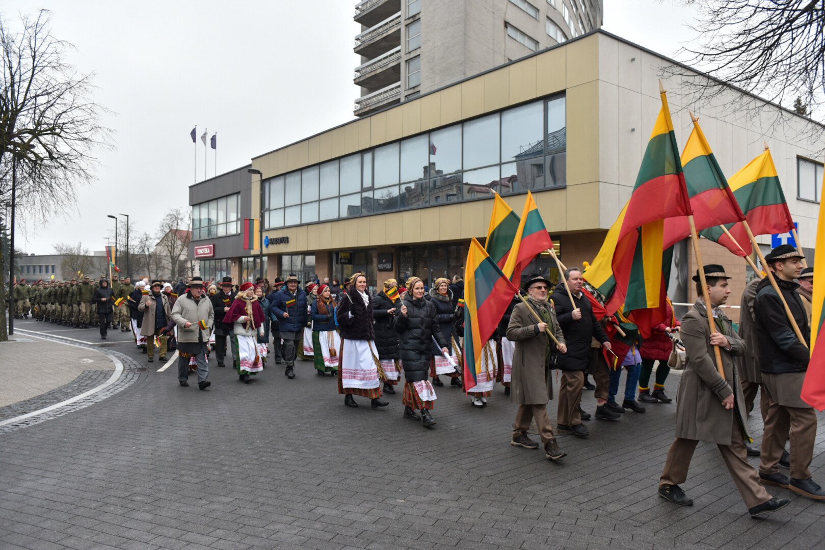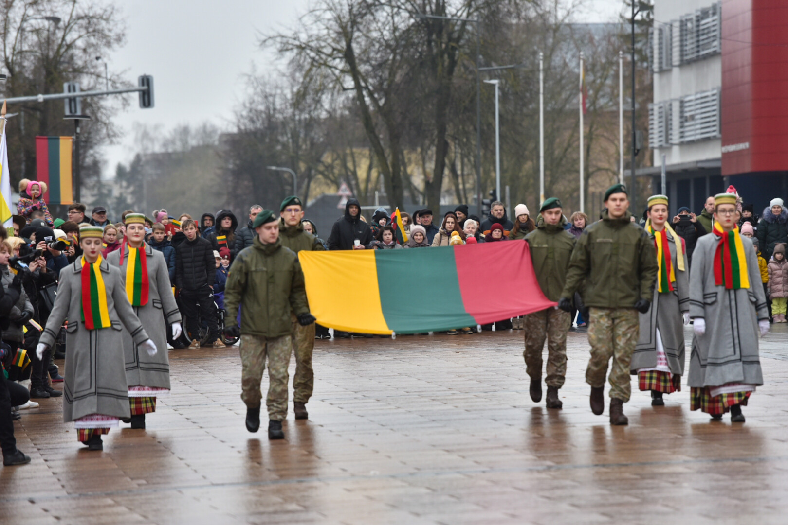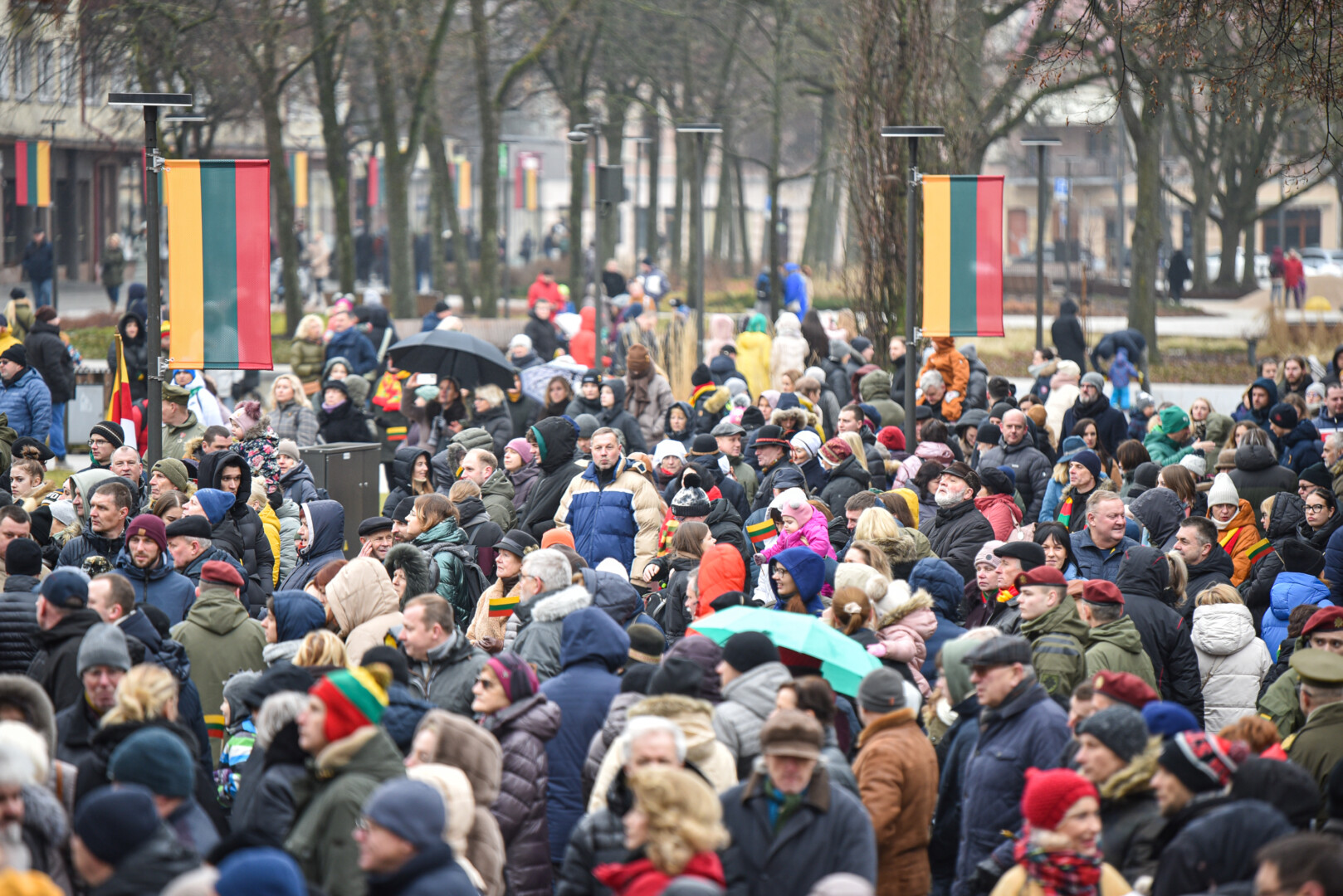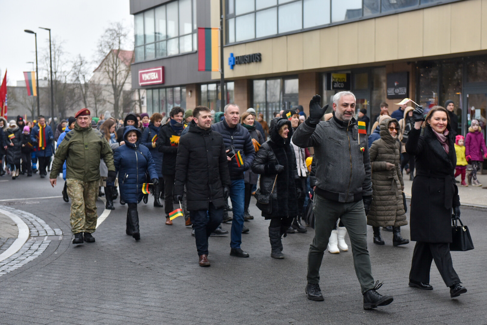 Po vėliavos pakėlimo, palydėto šūvių salvėmis, ceremonijos žmonių upė ištvino Vasario 16-osios gatvę – šventinė eisena nusidriekė į Panevėžio areną.