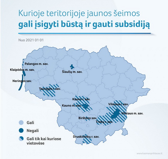 Atnaujinus savivaldybių, kuriose besikuriančios jaunos šeimos gali prašyti subsidijos pirmajam būstui įsigyti, sąrašą į jį šiemet vis dar nepateko Šiaulių miestas. Taip pat Vilniaus, Klaipėdos bei Neringos miestų savivaldybės.