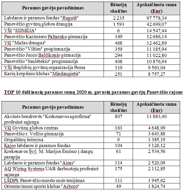 Daugiausiai paramos Panevėžio miesto gyventojai skyrė Labdaros ir paramos fondui „Rugutė” (97 tūkst. eurų), Panevėžio gyvūnų globos draugijai (42 tūkst. eurų) ir VŠĮ „EDMĖJA” (14 tūkst. eurų).Panevėžio rajone daugiausiai paramos, beveik 12 tūkst. eurų, skirta AB „Krekenavos agrofirma” profesinei sąjungai, VšĮ Gyvūnų globos centrui (4,6 tūkst. eurų) ir Velžio gimnazijai (3,6 tūkst. eurų).