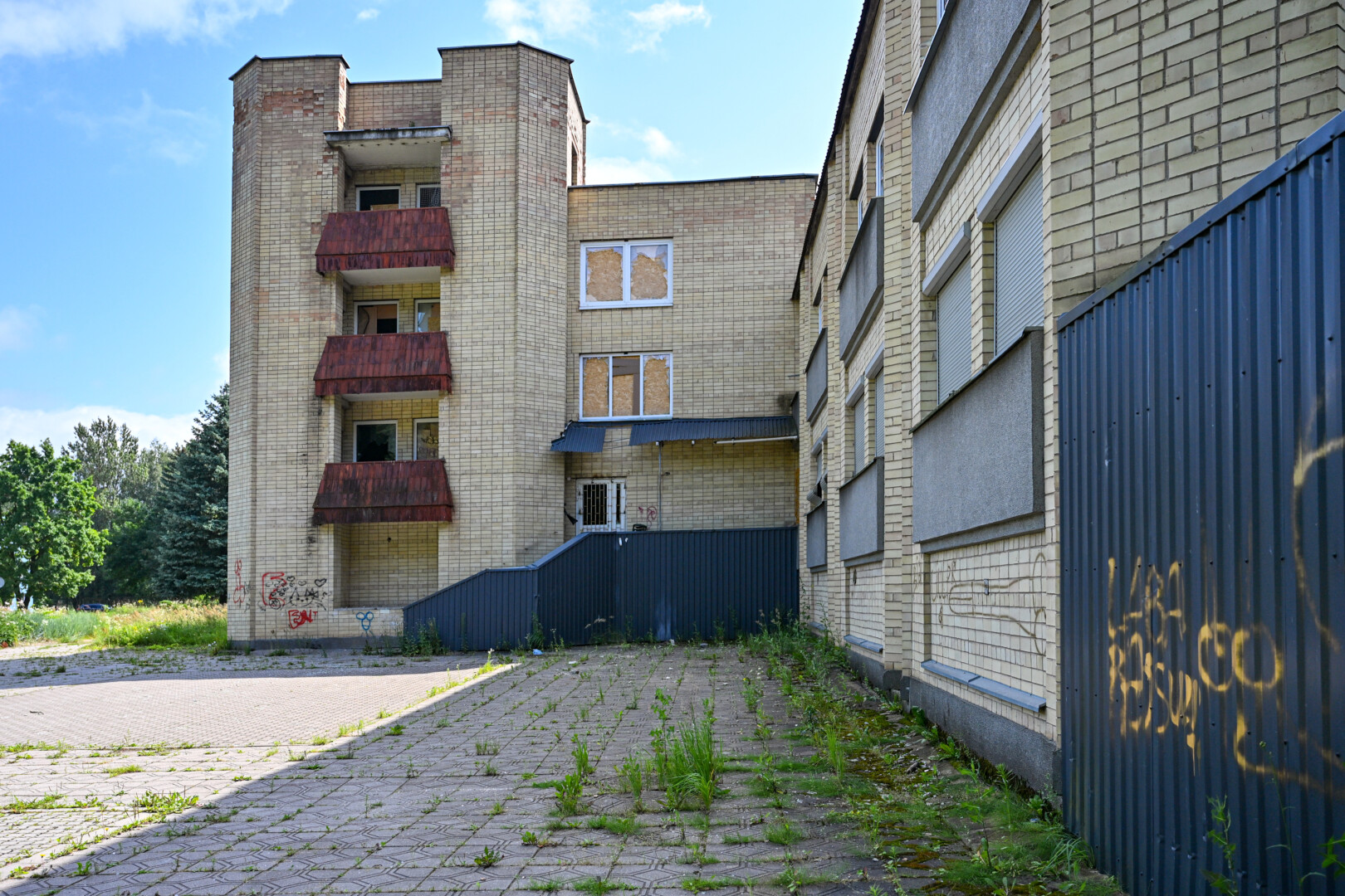 Išdaužtų langų stiklais nusėta visa pastato aplinka, kai kur kone žmogaus dydžio nepjauta žolė užgožia kadaise kiemą puošusius dekoratyvinius krūmus.