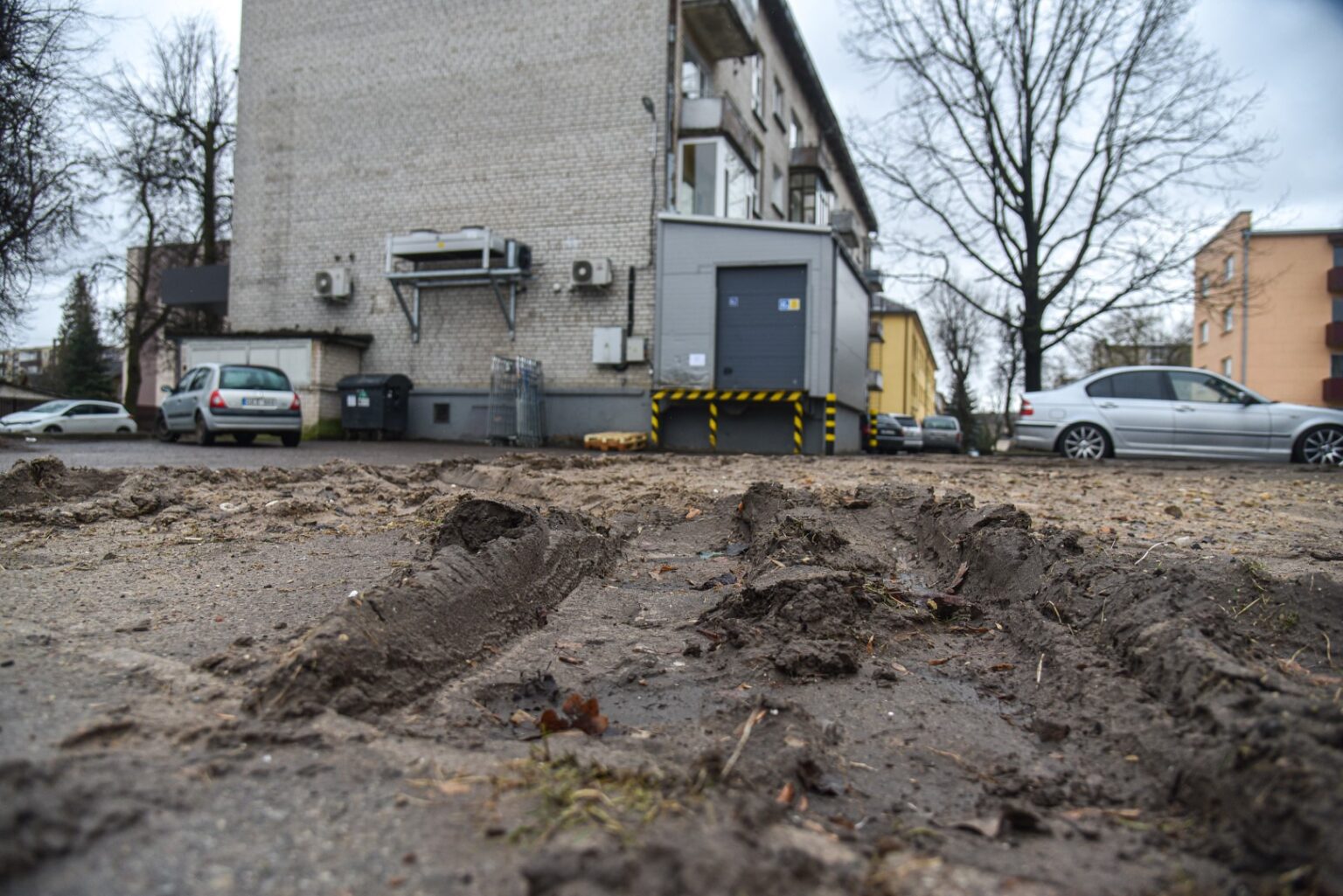 Kasdien prekes atvežančios sunkiasvorės mašinos, rėpliojančios per daugiabučio žaliąją zoną, net nespėjusią sudygti žaliąją veją pavertė melioracijos grioviais.