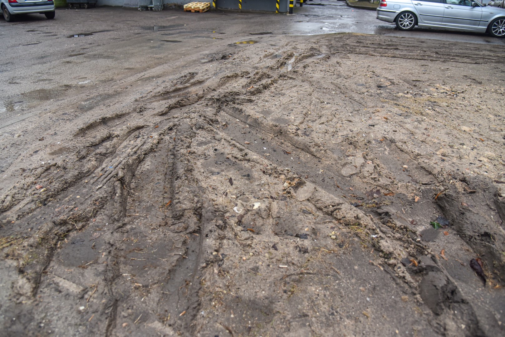 „Įvažiavimas į daugiabučio kiemą ir prekybos centro rampą – bendras. Į parduotuvę atvykstančios sunkiasvorės mašinos dideliais ratais ropoja per mūsų žaliąją veją. Po renovacijos visa veja buvo išlyginta, užsėta. Žolė net nespėjo sudygti – vilkikai ją pavertė didžiule klampyne“, – piktinosi namo pirmininkė.