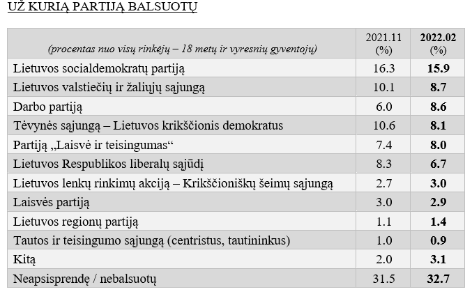 Lyginant su 2021 metų lapkričio mėnesio apklausos rezultatais, paklaidos ribose, tai yra 3 procentiniais punktais padidėjo Darbo partijos palaikymas (nuo 6 proc. iki 9 proc.). Visgi per šį laikotarpį, paklaidos ribose, 3 procentiniais punktais sumažėjo ketinančių balsuoti už Tėvynės sąjungą-Lietuvos krikščionis demokratus (nuo 11 proc. iki 8 proc.). Kitų partijų palaikymas nepakito ar pakito nežymiai.