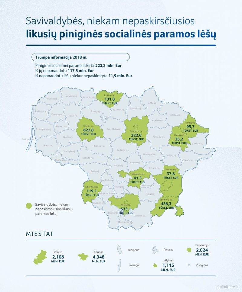 SADM duomenimis, nepanaudotus pinigus Lietuvos savivaldybės pranešė daugiausia skyrusios įvairioms socialinėms paslaugoms, šeimoje ir bendruomenėje teikiamai pagalbai vaikams, neįgaliesiems bei senyviems žmonėms, taip pat socialinių darbuotojų darbo sąlygoms gerinti, darbo užmokesčiui kelti bei kitiems tikslams, tačiau per visas savivaldybes vis tiek niekur nepanaudota liko 11,9 mln. eurų.