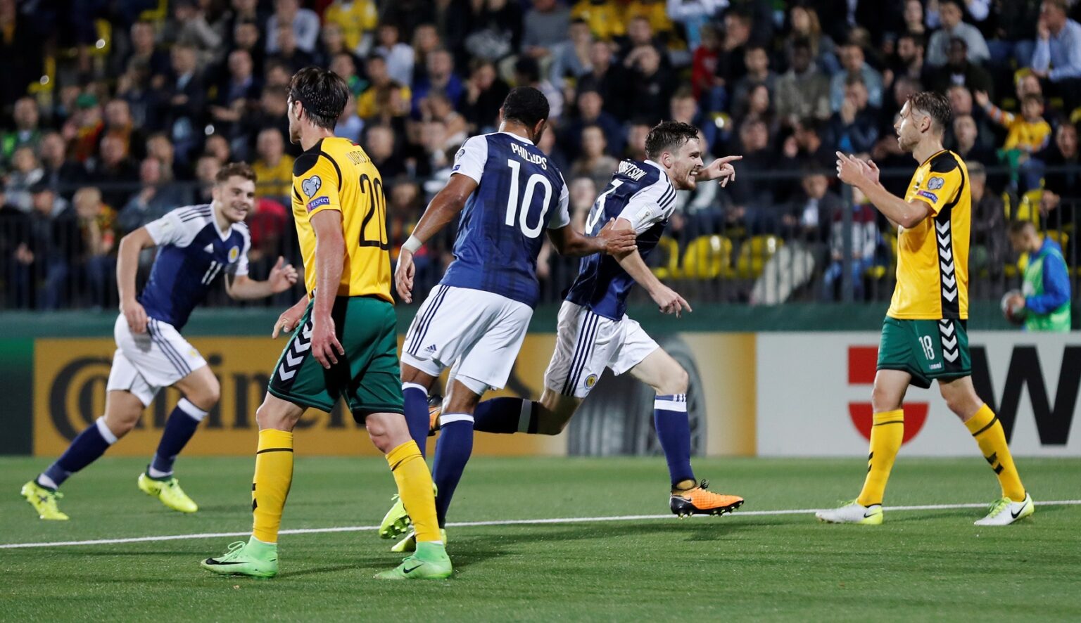 Po penkių minučių 2000 škotų sirgalių palaikomi svečiai pasinaudojo lietuvių sutrikimu ir nubaudė dar kartą. Andy Robertsonas iš baudos aikštelės prieigų puikiu smūgiu nuginklavo E. Šetkaus ginamus vartus ir vėl nesulaukė pasipriešinimo iš Lietuvos rinktinės gynėjų.