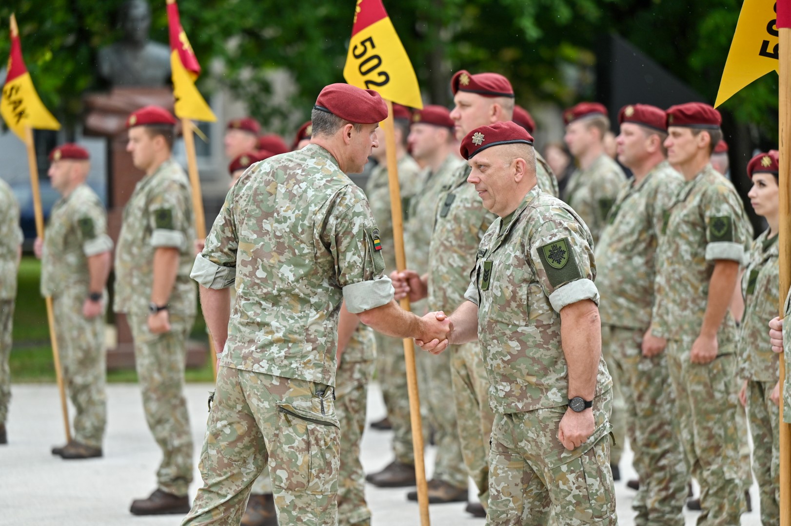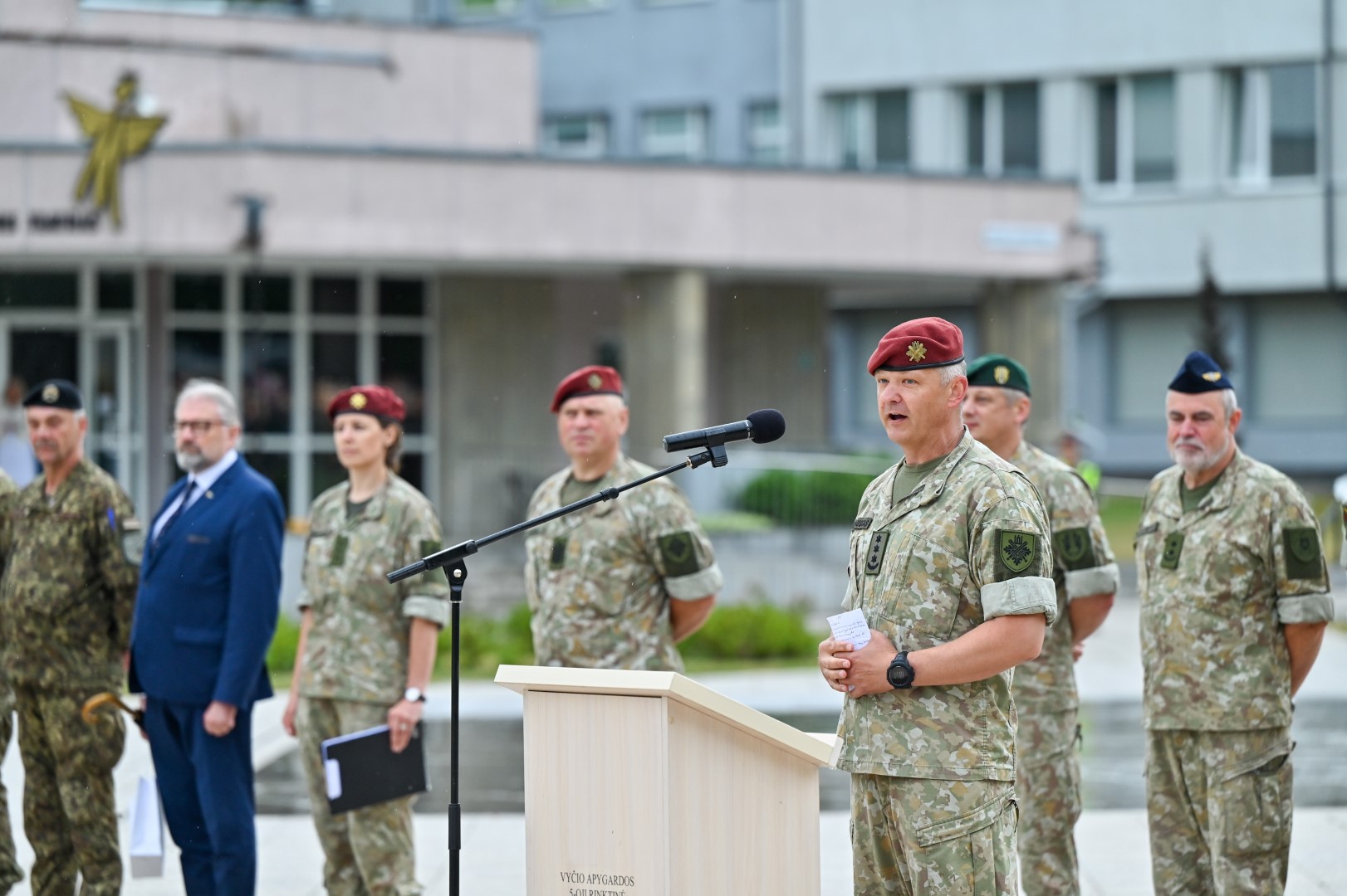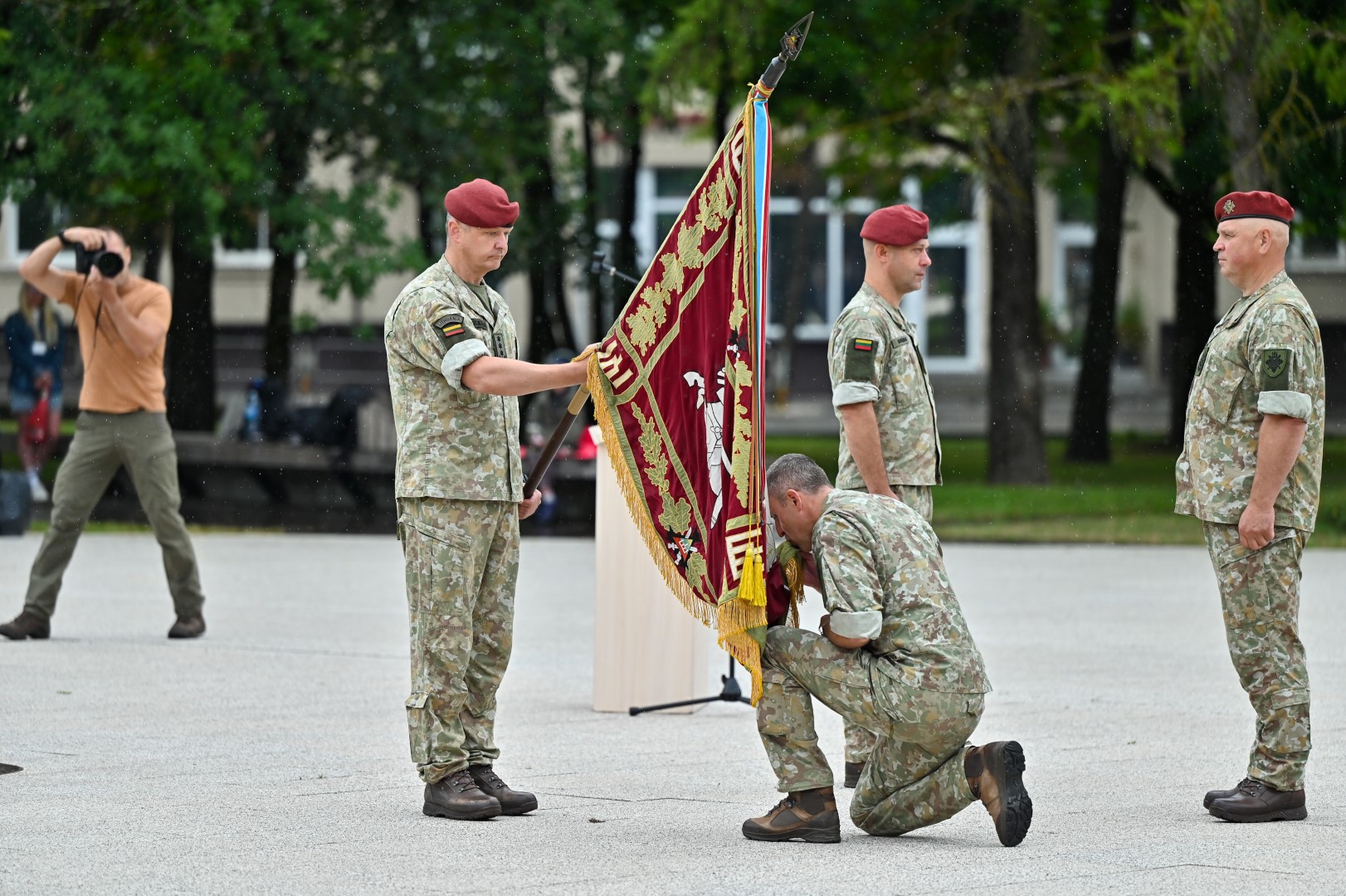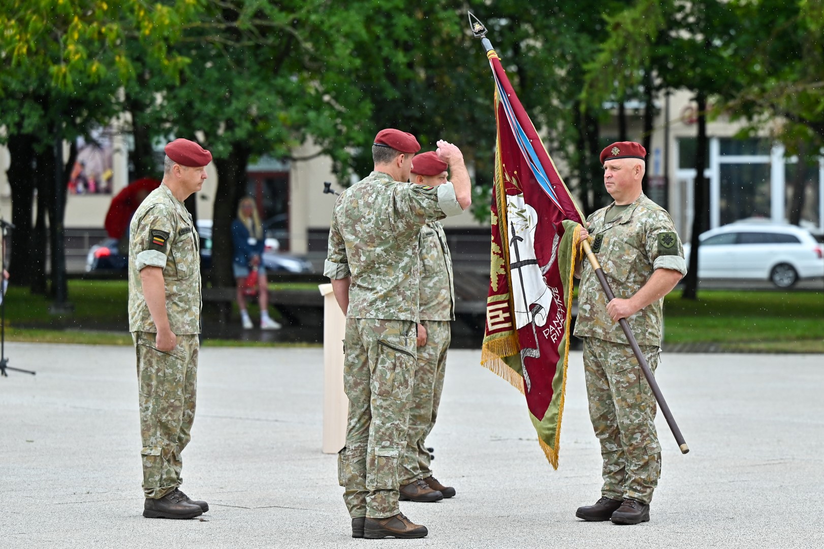 Krašto apsaugos savanorių pajėgų Vyčio apygardos 5-osios rinktinės vadas plk. ltn. Mindaugas Rekašius Rinktinės vėliavą perdavė įpėdiniui.