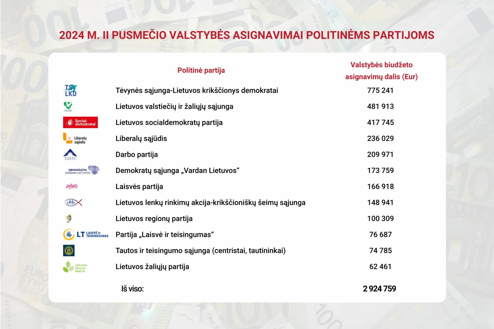 Iš viso 2024 m. valstybės biudžete numatyta 6,127 mln. eurų politinių partijų asignavimams. Dotacijos skirstomos dukart per metus – iki kiekvienų metų balandžio 15 d. ir iki lapkričio 15 d. Balandį politinėms jėgoms jau buvo paskirta 2,967 mln. biudžeto lėšų.
